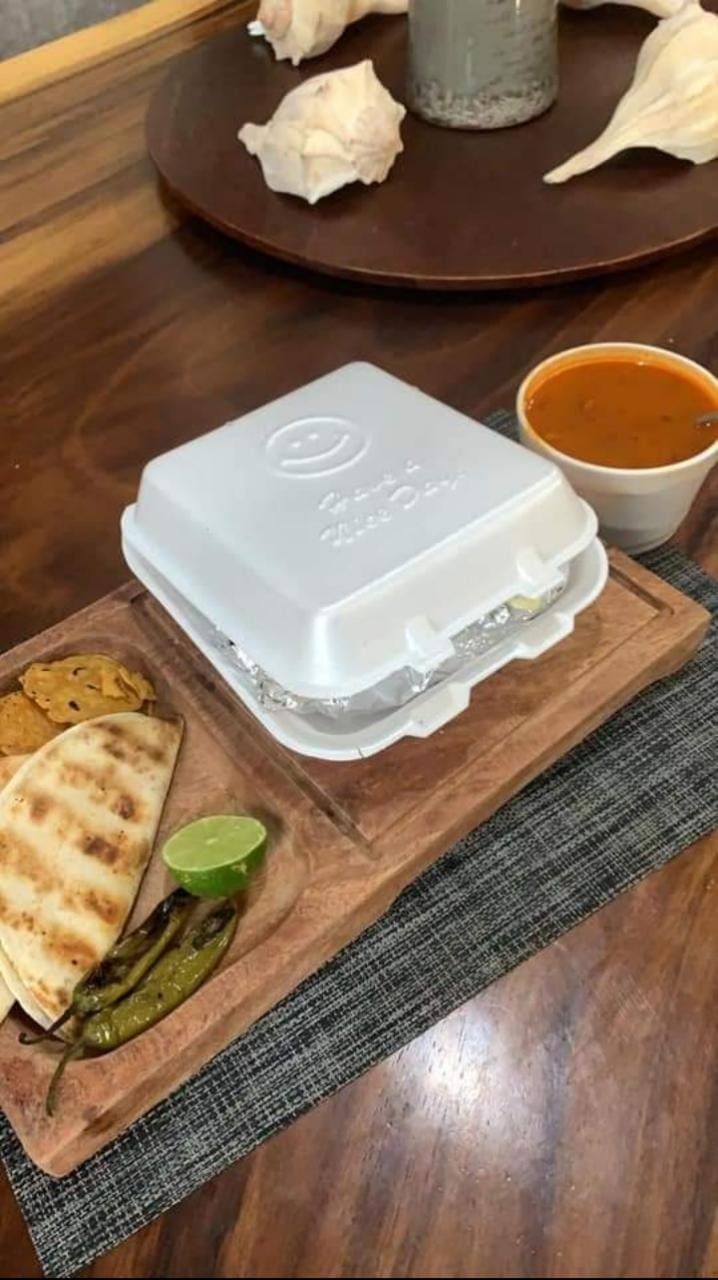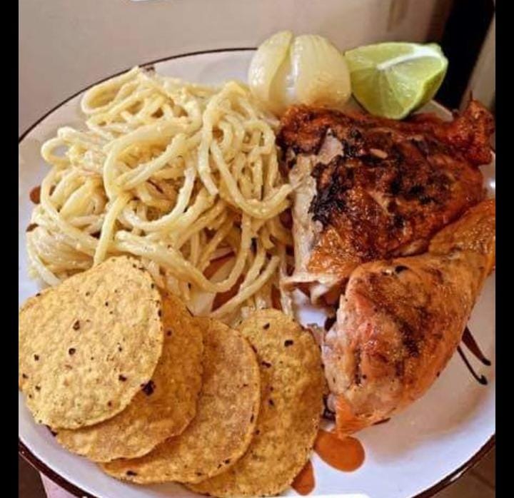 1 pollo asado, 1/2 litro de frijoles charros, 1 burrito asadero, 1 burrito norteño, salsa, tortilla, cebolla, limón, y totopo.