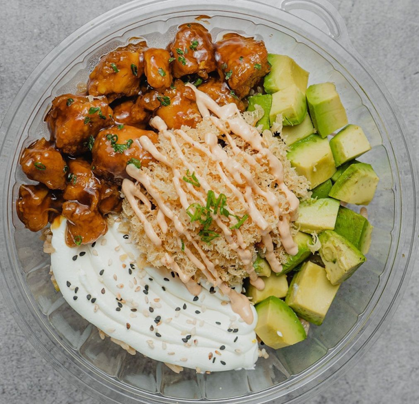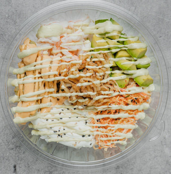 Arroz frito japonés, kurai chicken, Philadelphia, aguacate, cebollín, tempura flakes y chipotle mayo.