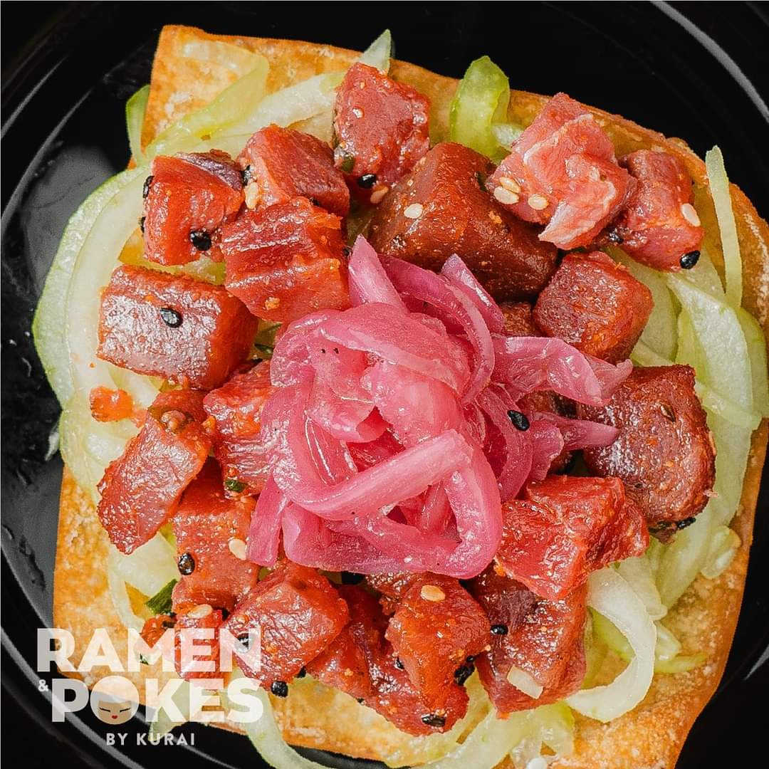 Osaka Tuna, aguacate, jícama, pepino, wonton chips y cebollita morada encurtida.