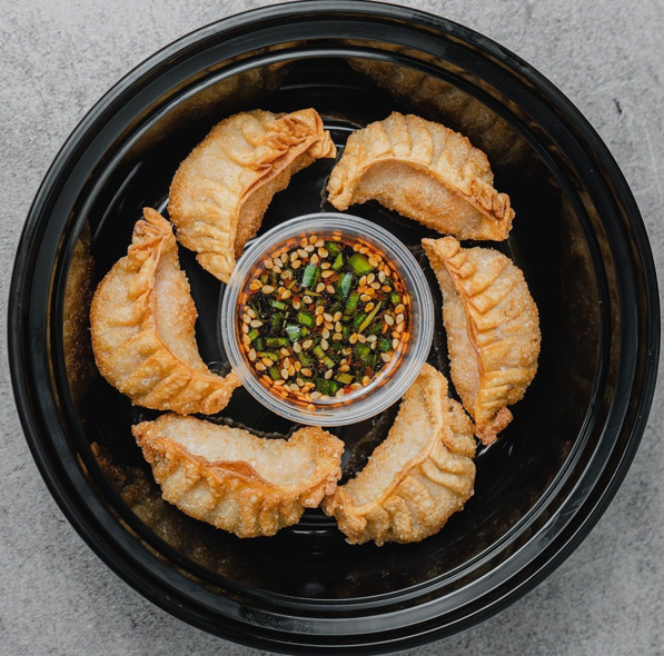 6 Gyozas fritas con un toque de aceite de ajonjolí y jengibre.
