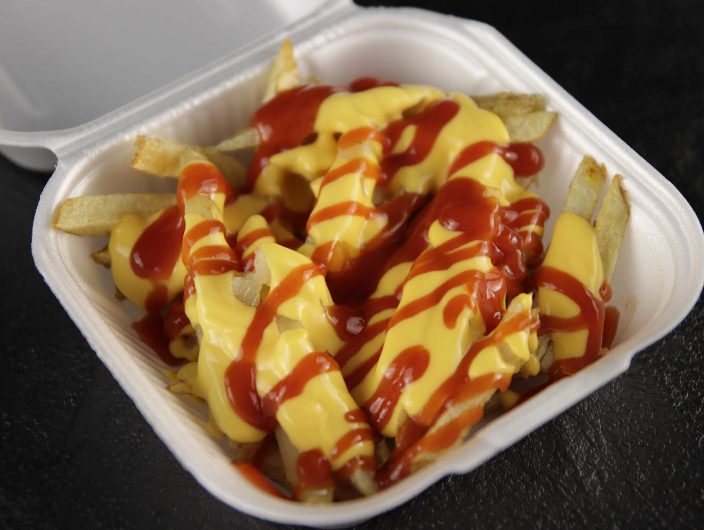 300grs de papá natural, salchicha de pavo, queso amarillo y cátsup