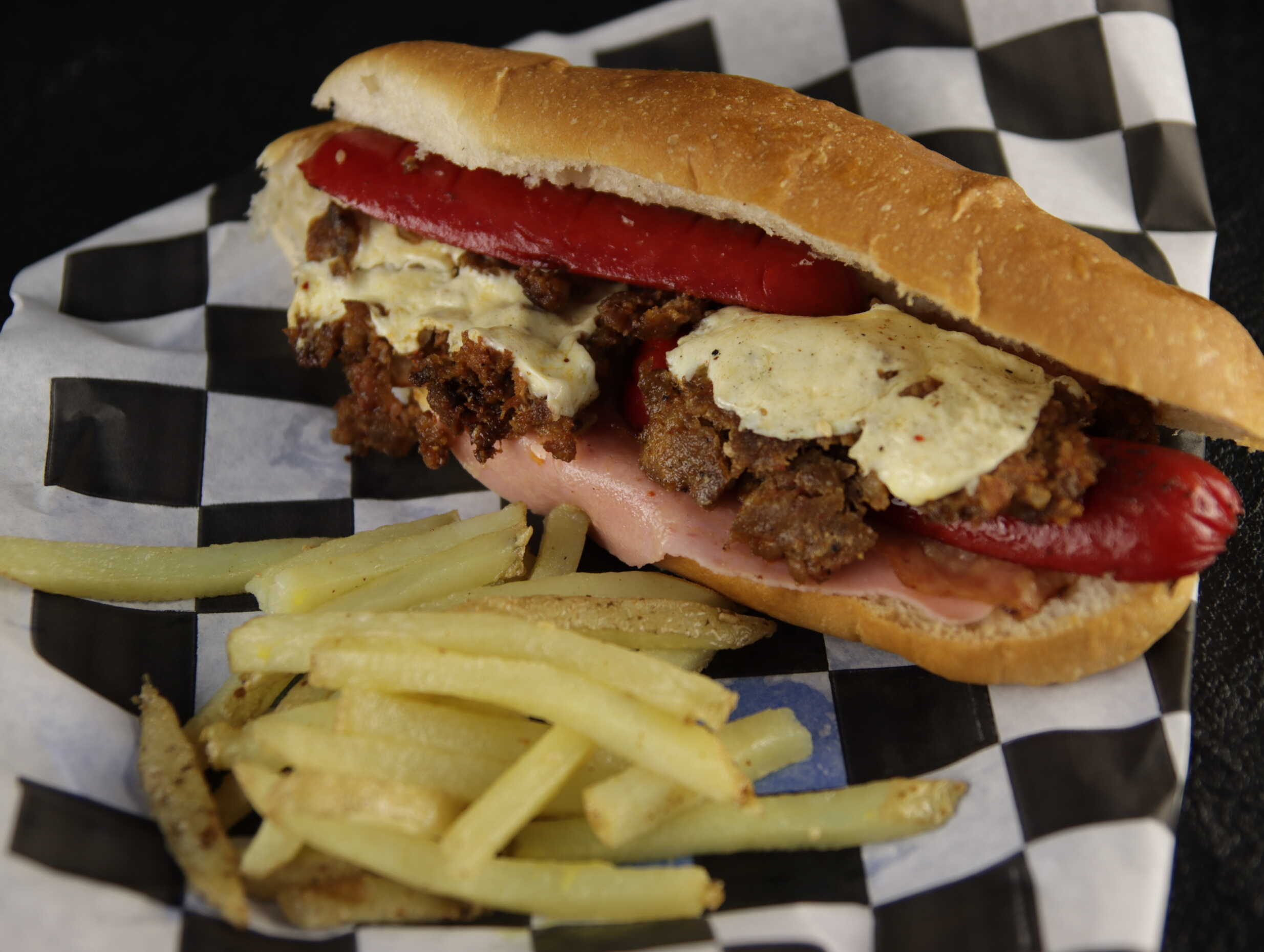 Pan Artesanal, Boneless, queso amarillo, mayonesa, cátsup, tomate, aguacate, lechuga y ensalada