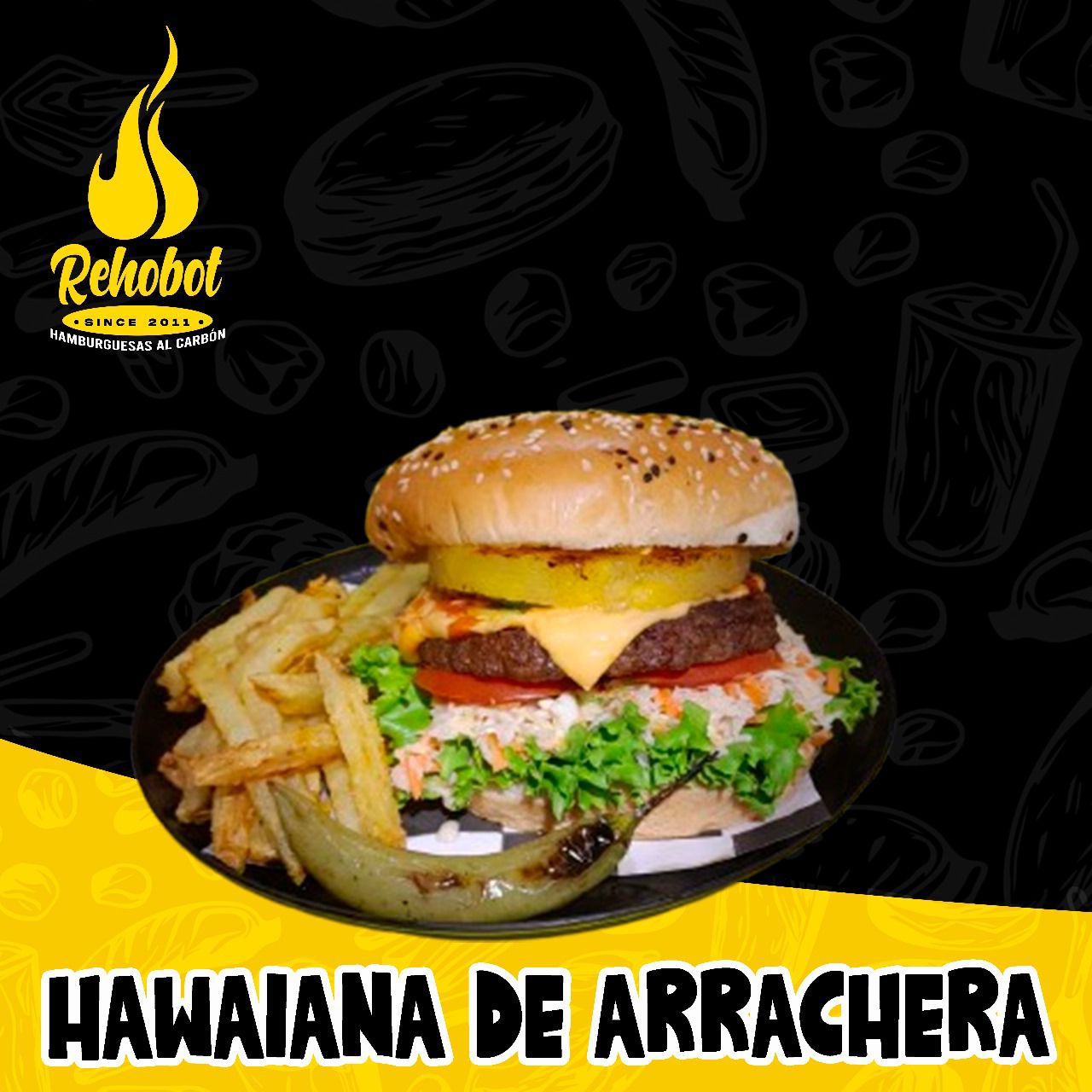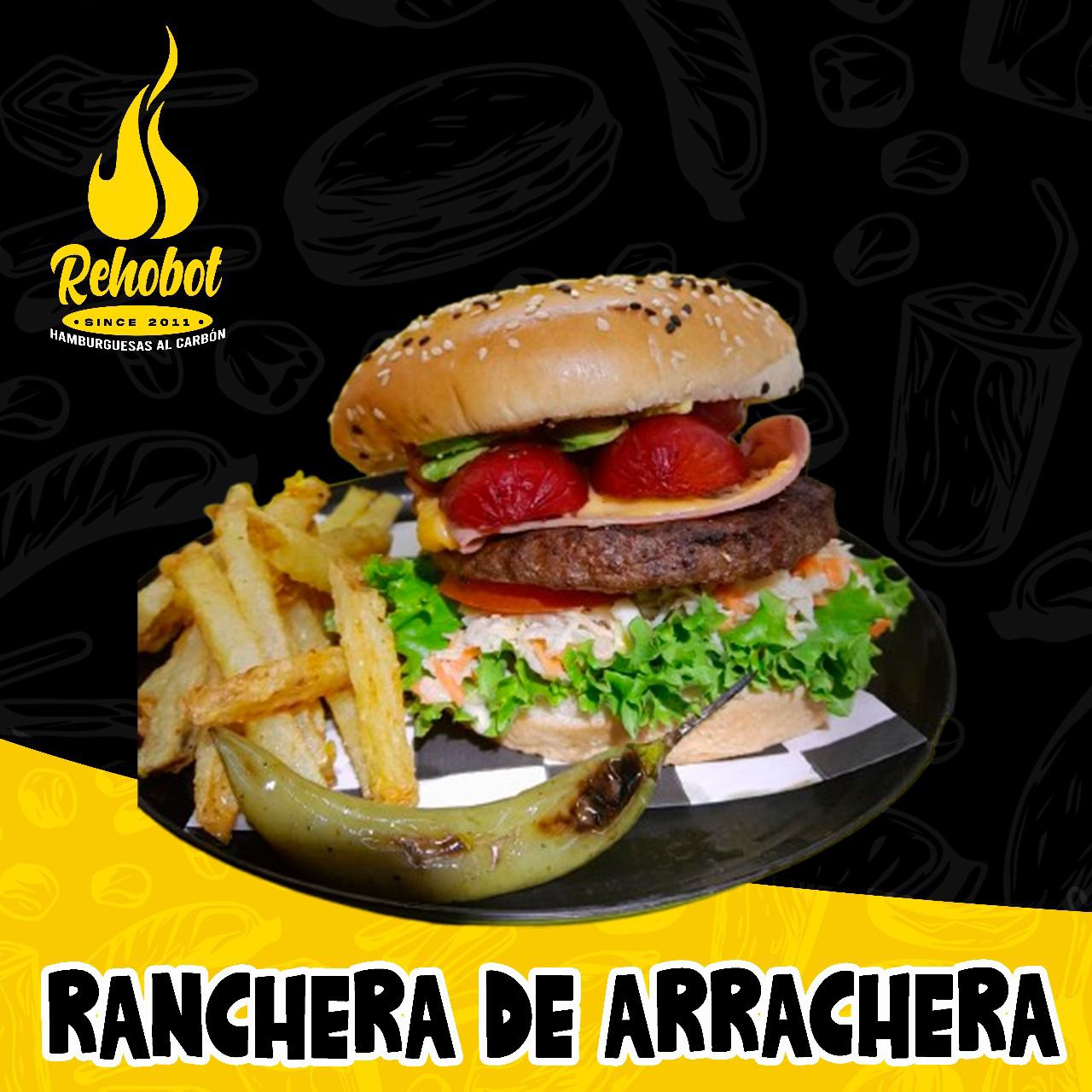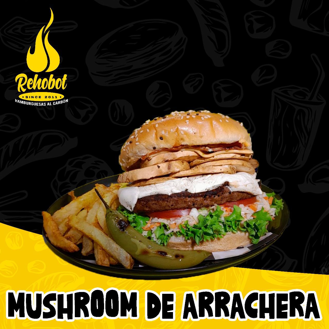 Pan Artesanal, Carne, queso amarillo, champiñones, queso asadero, tocino y jamón, mayonesa, cátsup, tomate, aguacate, lechuga y ensalada