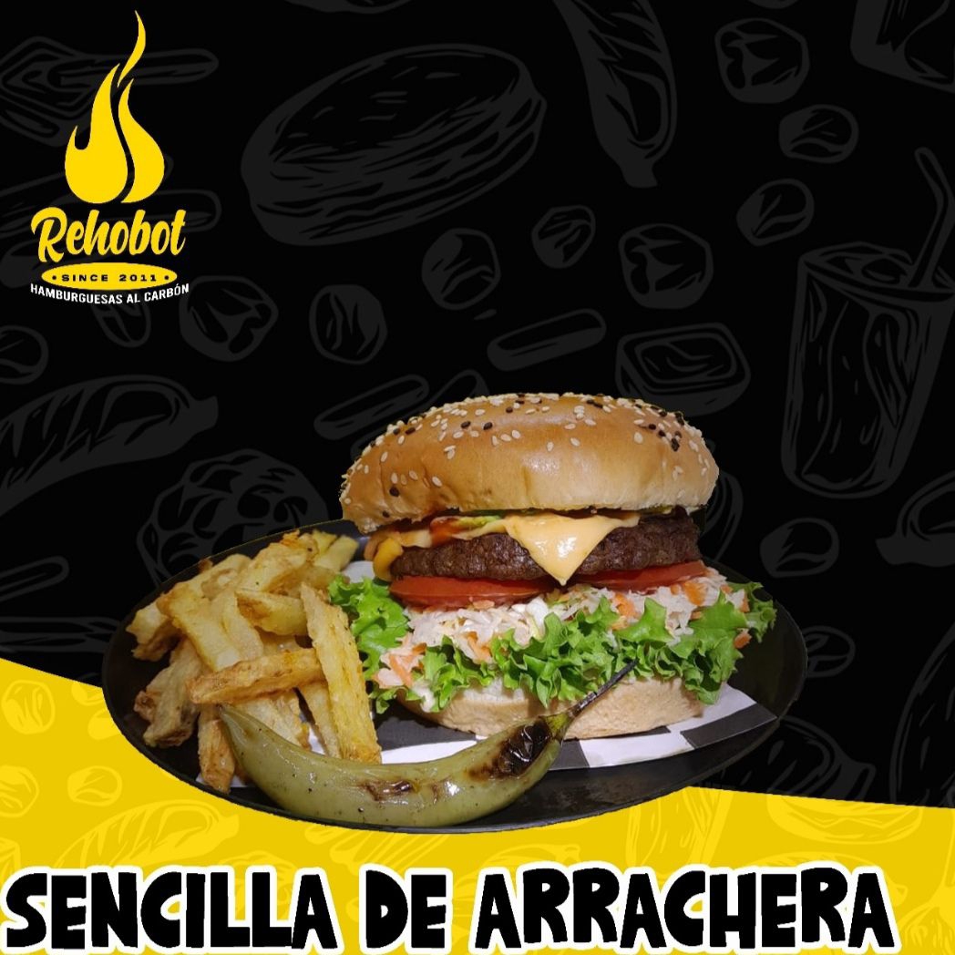Pan Artesanal, Carne, queso amarillo, mayonesa, cátsup, tomate, aguacate, lechuga y ensalada.