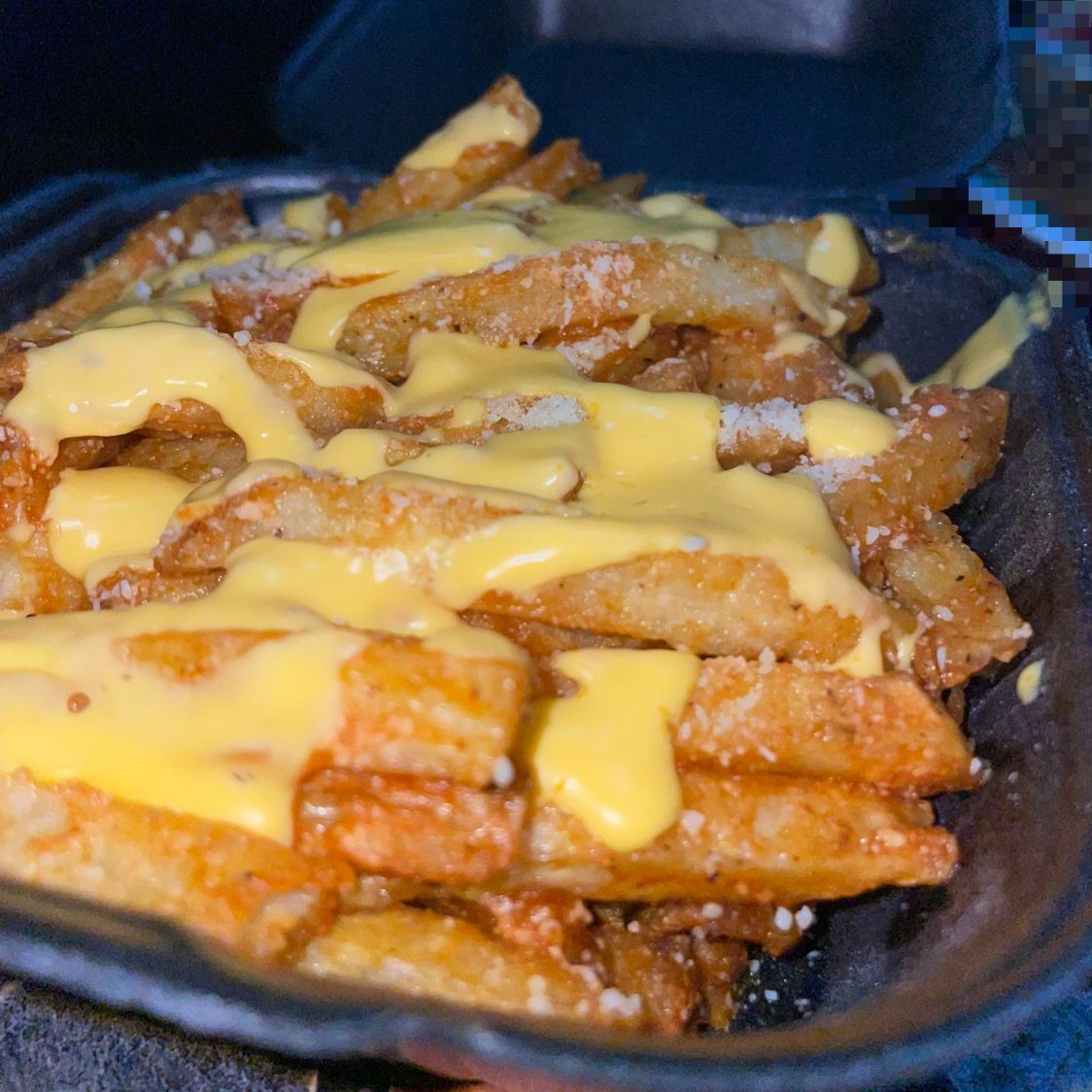 Papas bañadas en salsa búfalo parmesano y queso amarillo