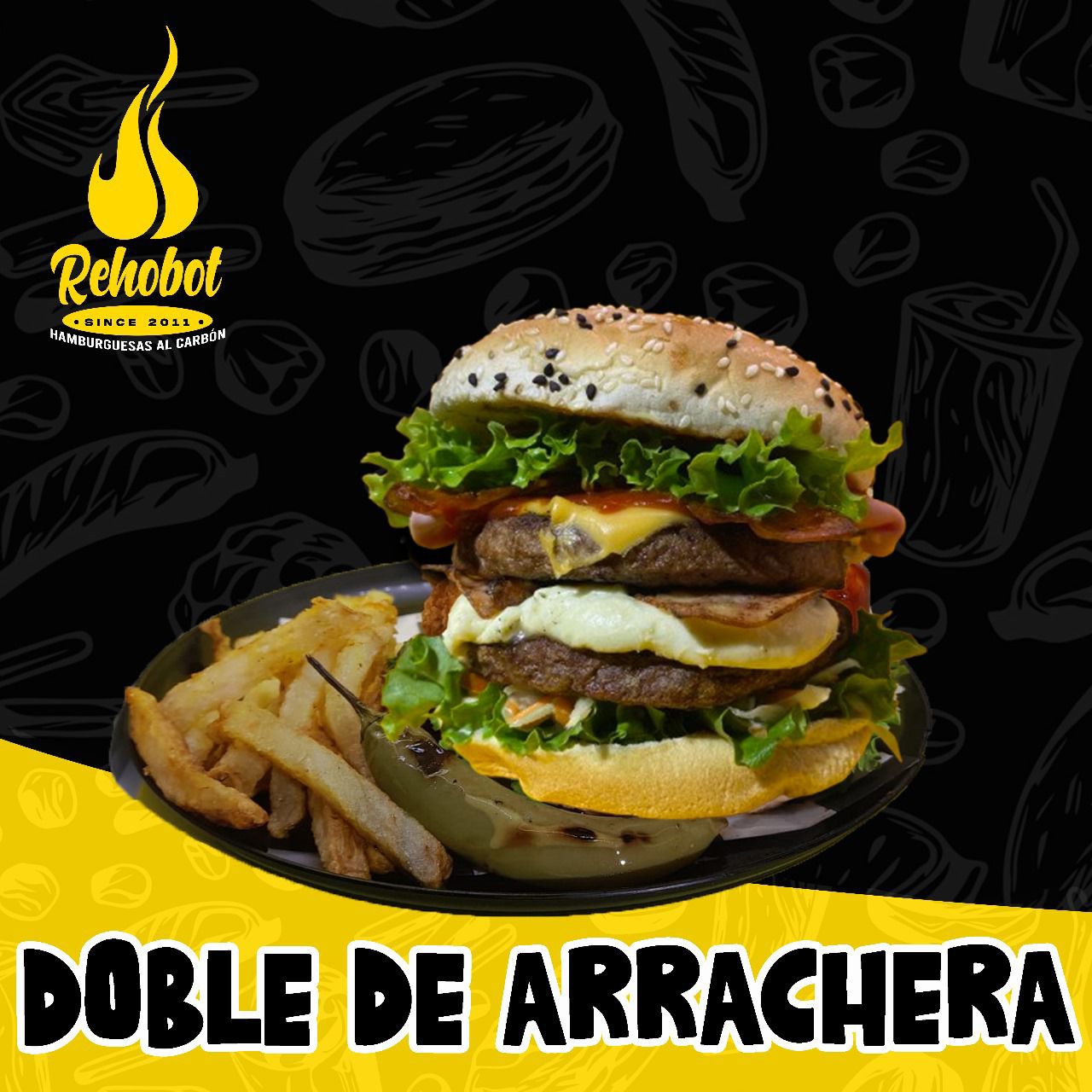 Pan Artesanal, Doble Carne, Doble queso amarillo, Doble tocino, Doble jamón, mayonesa, cátsup, tomate, aguacate, lechuga y ensalada
