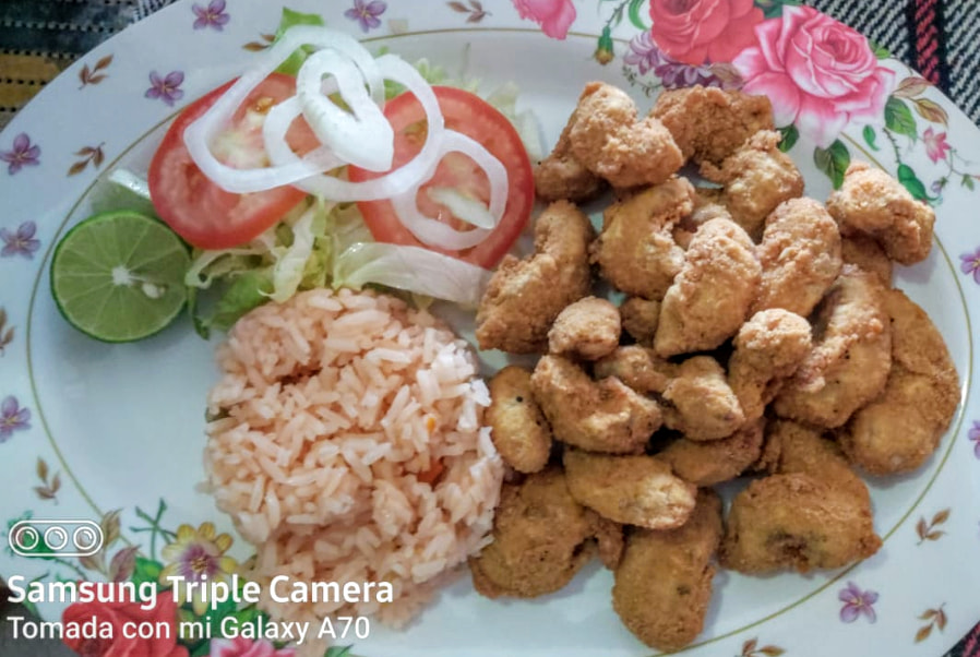 Mollejas de pescado guisadas con mantequilla, cebolla. Acompañado de arroz, ensalada, tortillas y salsa.