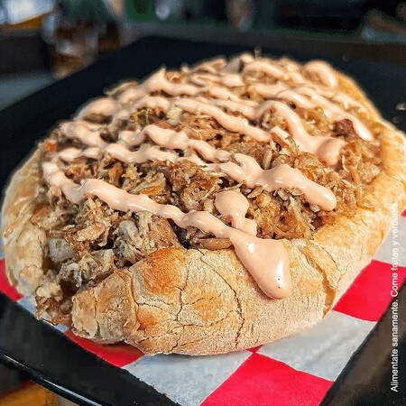 Pan francés, 1 base de aderezo de chipotle, lechuga fresca, tomate, cebolla, aguacate, 1 sabrosa porción de carne de puerco y arriba un acabado de aderezo de chipotle.