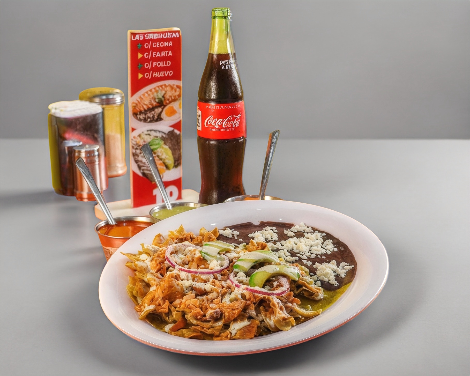 Guiso de chicharrón de cachete (con la receta secreta de "Triny"), aguacate, aros de cebolla morada, crema, acompañados de frijol y queso.