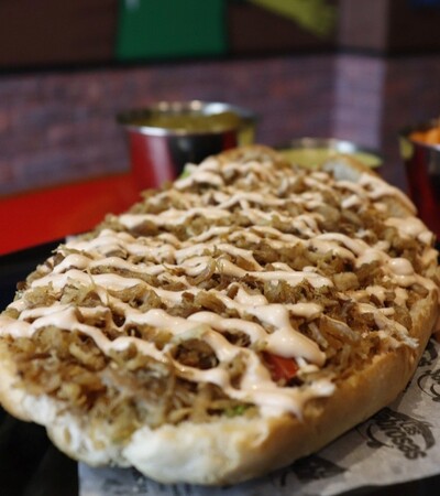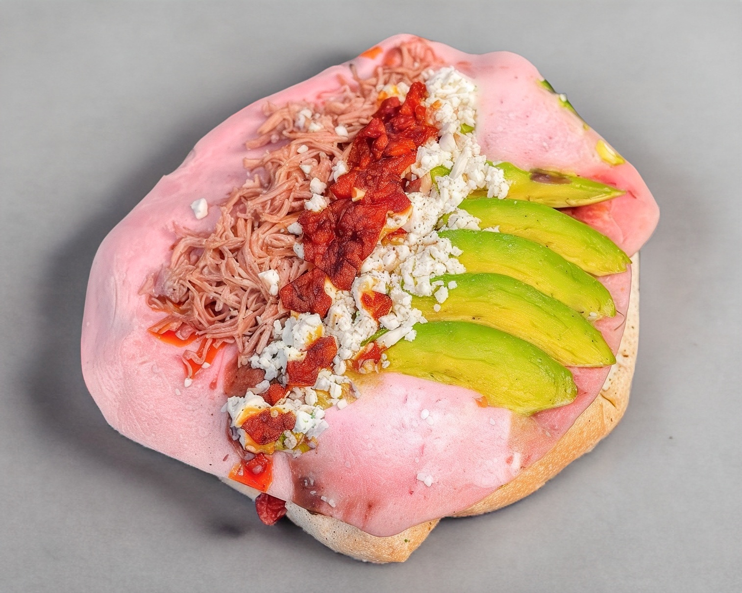 Pan francés jumbo, 1 base de aderezo de chipotle, tomate, cebolla, aguacate, 1 sabrosa porción de carne de puerco y arriba un acabado de aderezo de chipotle.
