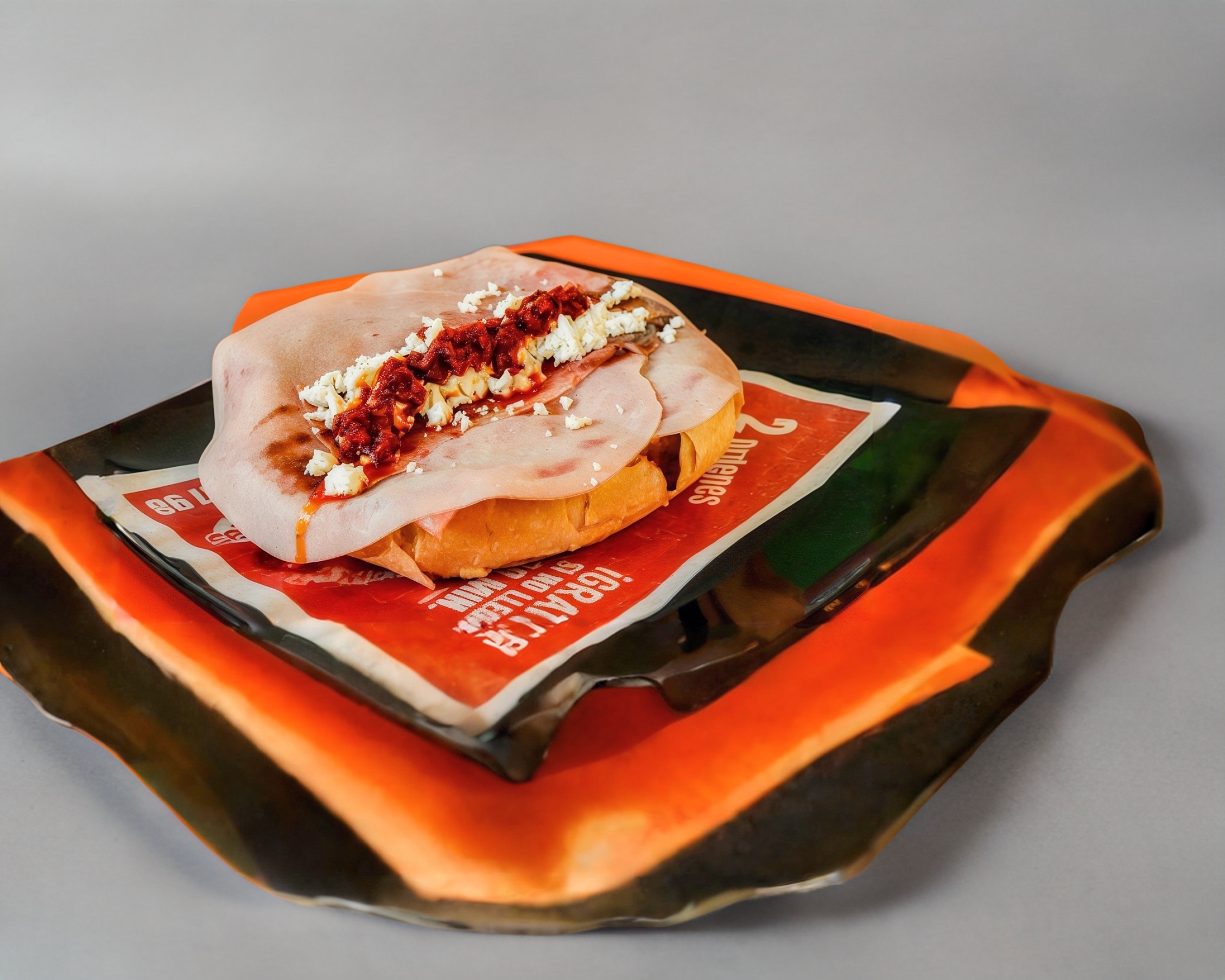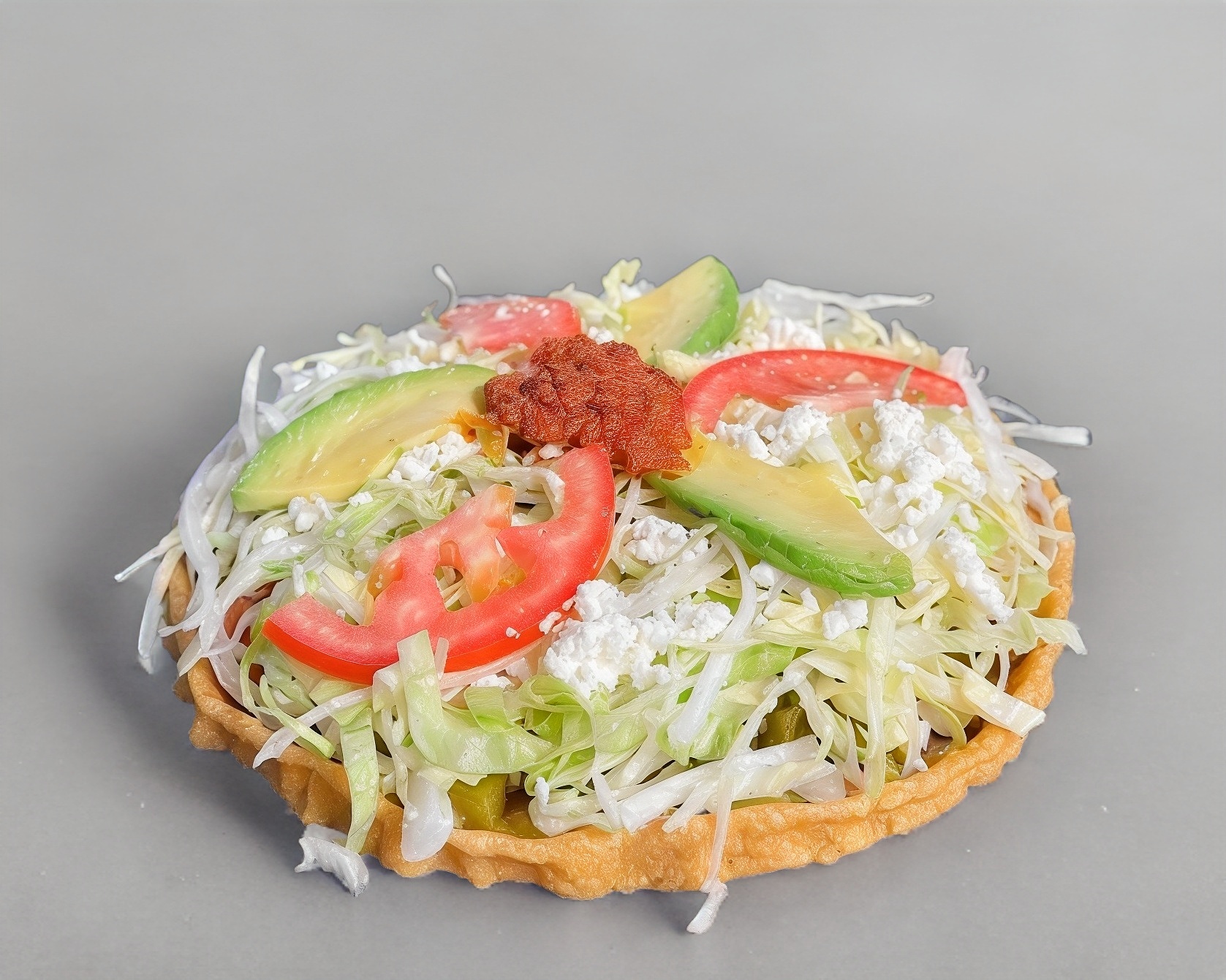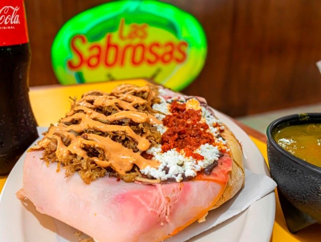Pan Francés jumbo, 4 rebanadas de jamón del bueno, 4 porciones de queso de puerco, 2 quesos amarillo, tomate, cebolla, aguacate, chicharrón seco, 4 porciones de queso molido fresco, chorizo del bueno, media porción de carne de puerco y arriba un acabado de aderezo chipotle