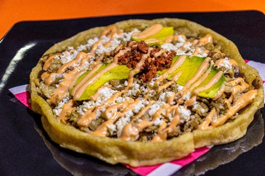 Con chicharron de cachete incluyen frijoles, queso, aros de cebollamorada, aguacate y crema