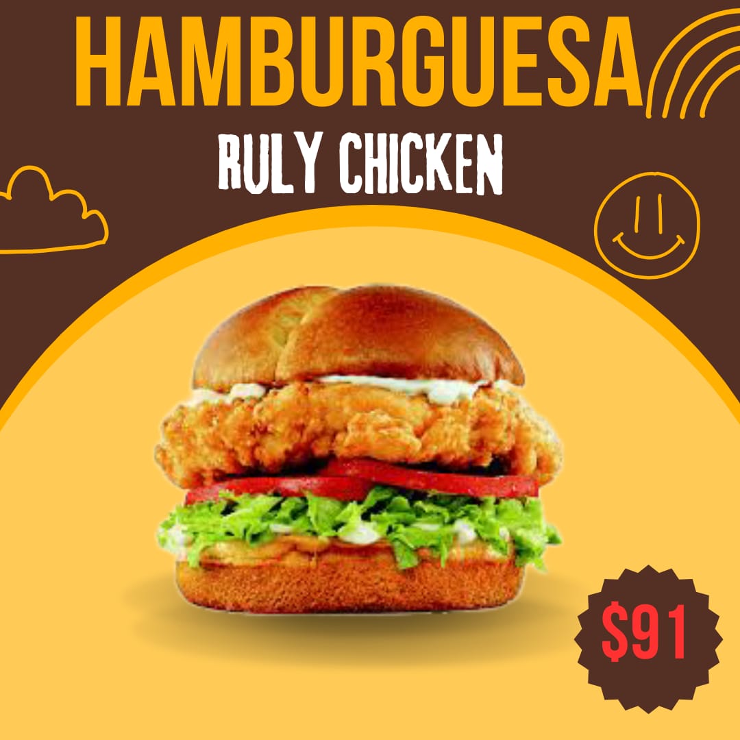 Pan con ajonjolí, tomate, lechuga, cebolla, queso amarillo, aderezos, pechuga apanada con papas a fritas. (Platillo Personal y Salsas a elección incluidas, sin o aparte)