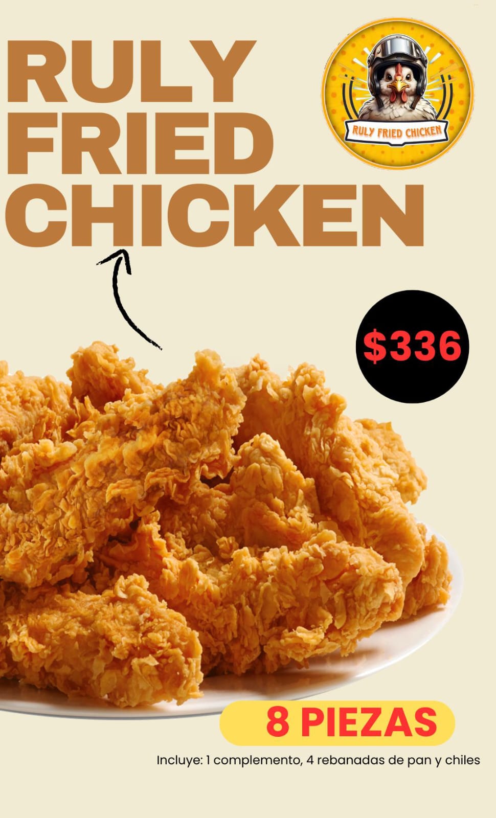 6 piezas de pollo frito + 1 complemento de 8oz pure de papa o sopa de coditos), catsup y chiles en vinagre