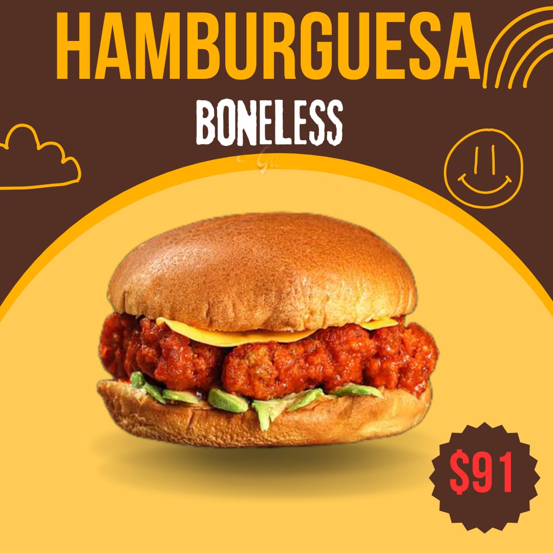 Pan con ajonjolí, tomate, lechuga, cebolla, queso amarillo, aderezos, boneless con papas a fritas.