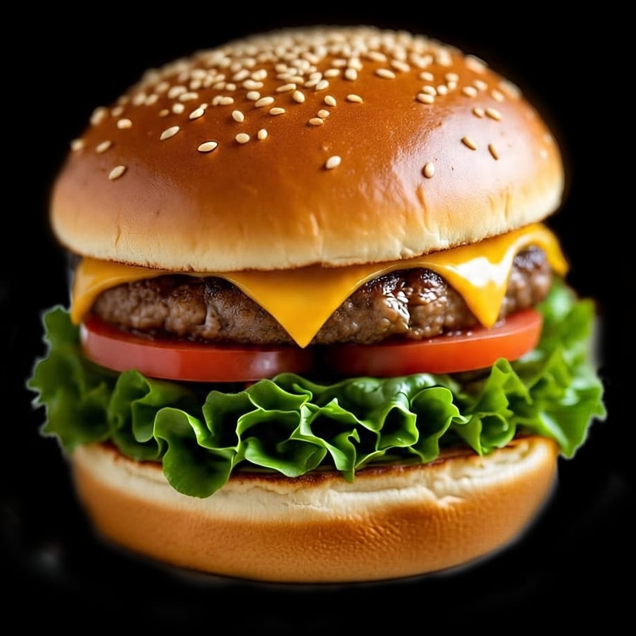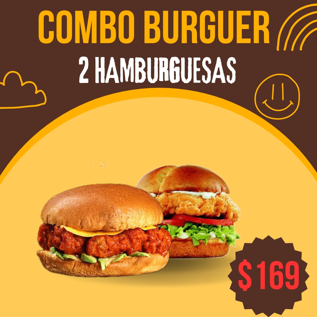 Pan con ajonjolí, tomate, lechuga, cebolla, queso amarillo, aderezos, carne de res o boneless con papas a fritas.