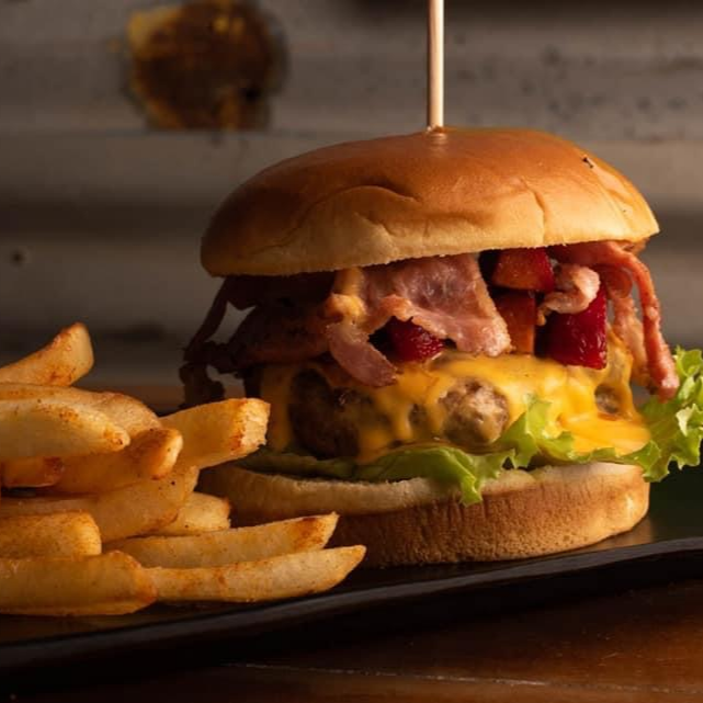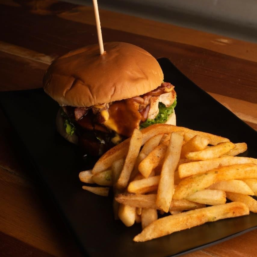 180gr de carne de res 80/20 hecha en casa gratinada con queso chedar, montada sobre nuestro bollo artesanal, tocino cebolla caramelizada, aderezada en BBQ, y papas
