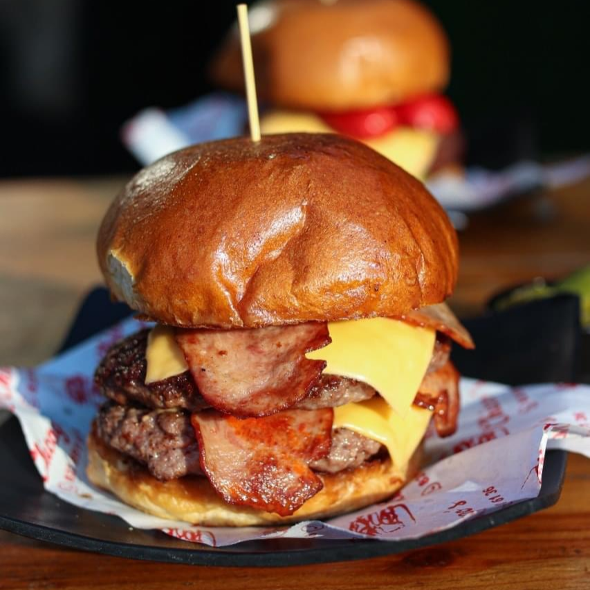 Doble carne, doble queso, doble tocino montada en nuesto bollo artesanal, mayonesa cebollas caramelizadas, y papas