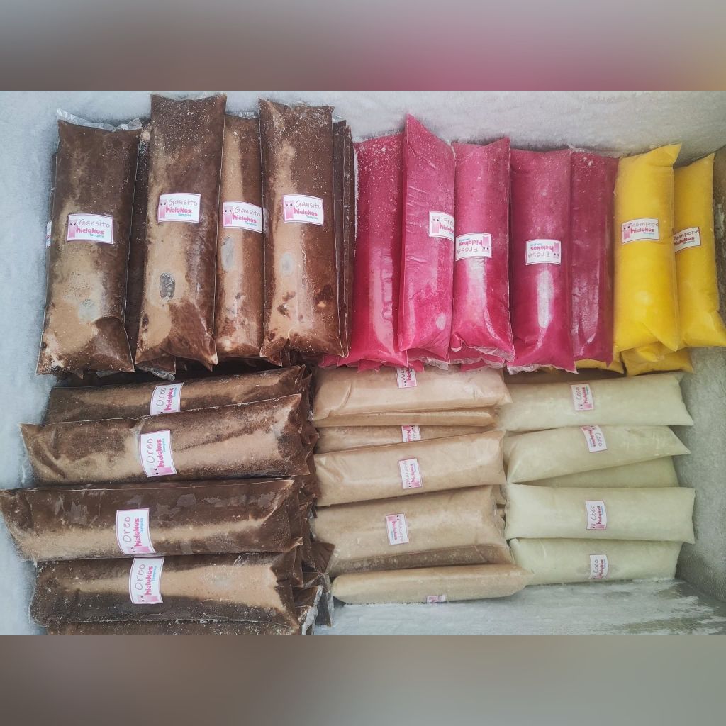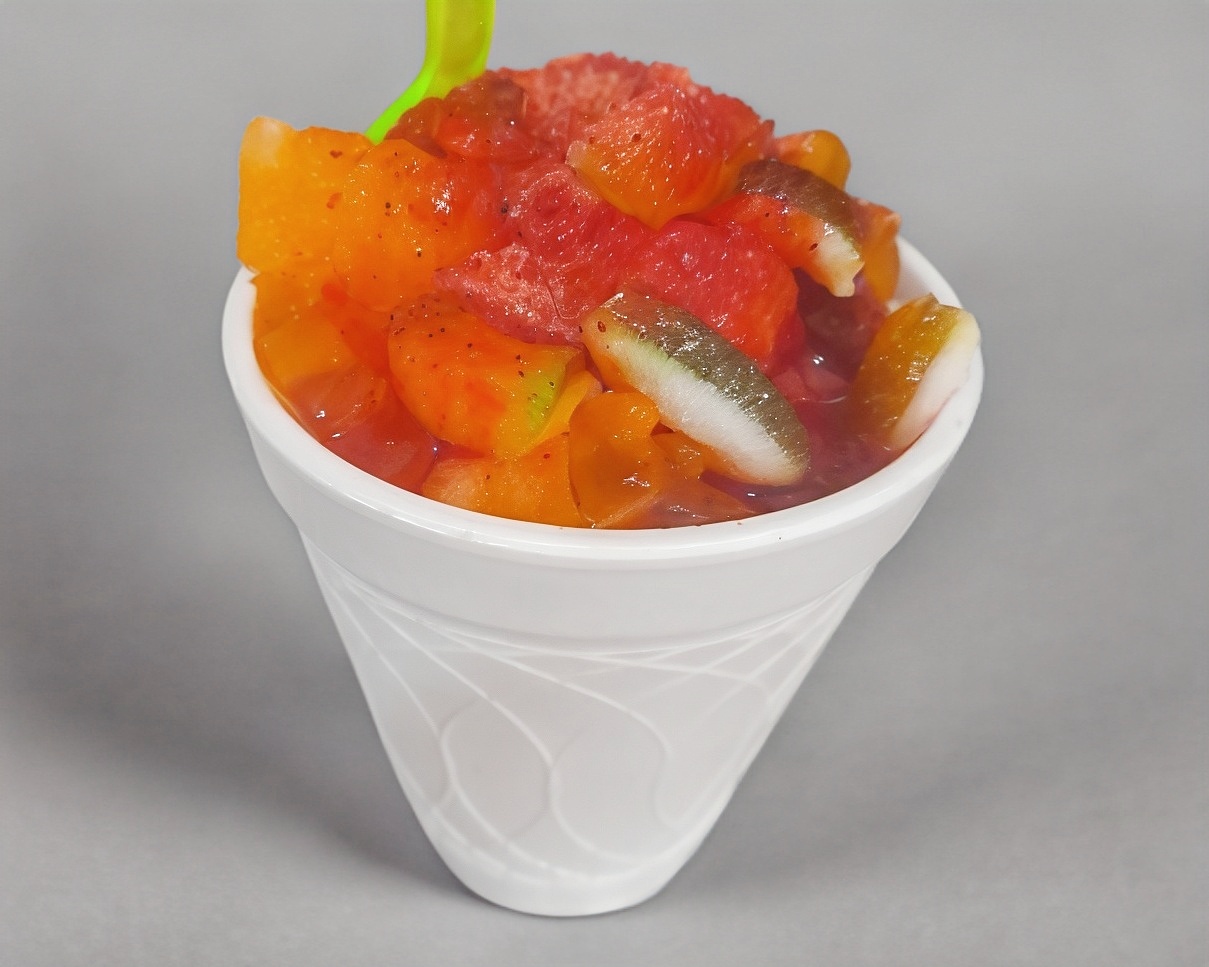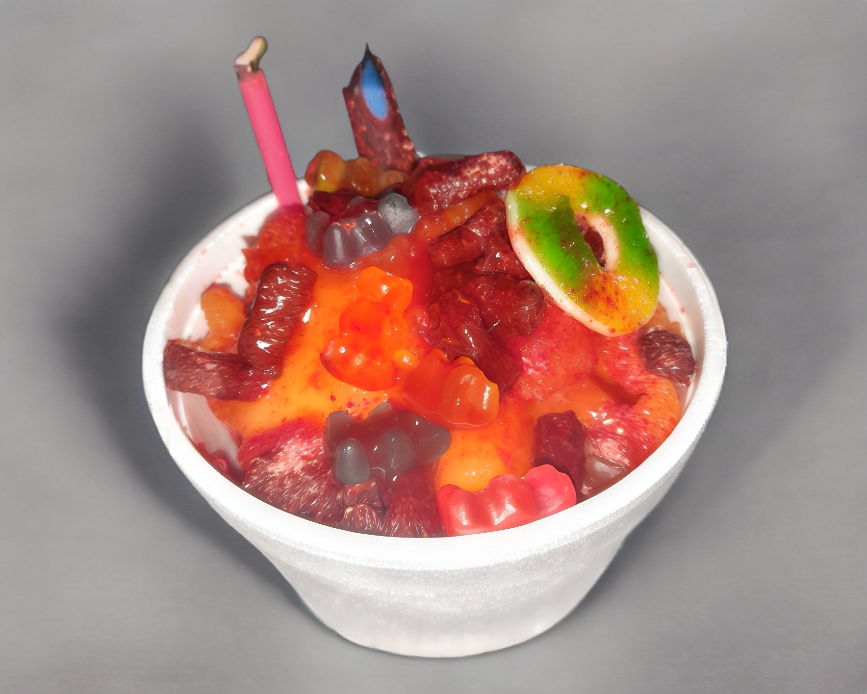 Jugo de naranja congelado,tajin,miguelito,chamoy y variedad de gomitas