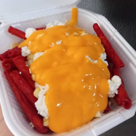 ( es casi medio litro)Maiz desgranado,mayonesa,queso blanco,queso amarillo y sabrita( salsa y cacahuates van aparte ). Cuento con ,tostito flamin o verde mandar mje para elegir su sabrita