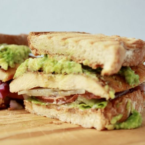 Pan chapata, mayonesa, pechuga a la plancha, queso cheddar, tocino, cebolla morada, lechuga, jitomate y aguacate.