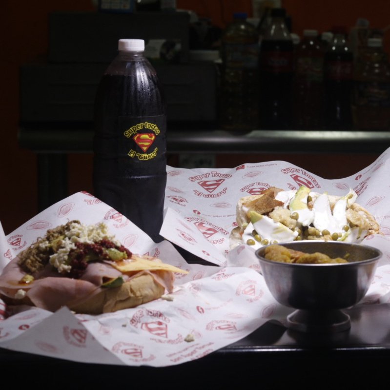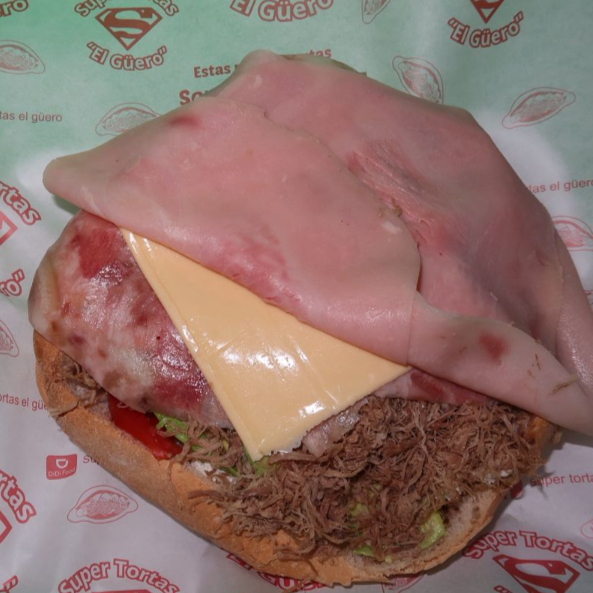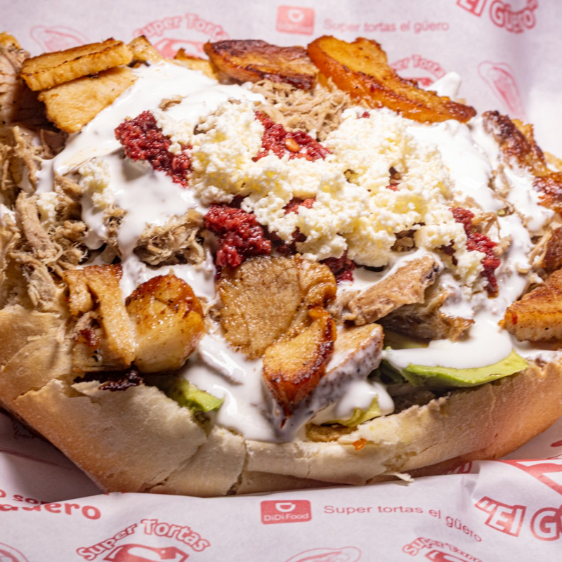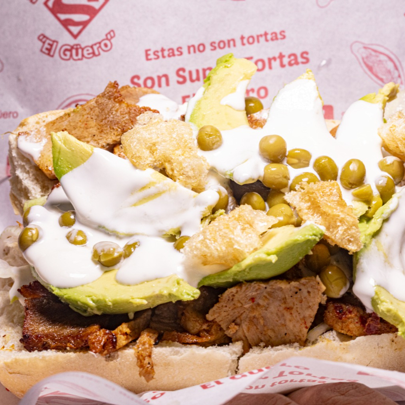 Pan francés con frijol, jamón (4 rebanadas), chicharrón dorado, aguacate, tomate, cebolla, chorizo, queso blanco, queso de puerco (2 rebanadas), queso amarillo y carne deshebrada. Se acompaña con salsa de chicharrón aparte. Porción individual.