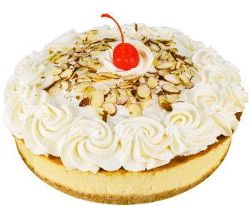 Cheesecake de queso horneado en base de galletas de vainilla con nueces, cubierto de rodajas de plátano, sobre una cama de cajeta coronado, decorado con la inigualable crema Suspiros, espolvoreado con canela, hojuelas de almendra y una cereza al centro.
