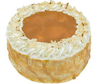 Pan de vainilla, salseado con una deliciosa mezcla de 3 leches, doble relleno de cajeta, cubierto de Crema Suspiros, decorado con un espejo de cajeta y nuestra exquisita Crema Suspiros y almendra fileteada