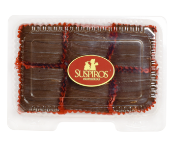 Exquisito pastel combinado de chocolate y vainilla, salseado con jarabe natural, con doble relleno entre cada capa de pan de trocitos de delicioso bubulubu, mermelada de fresa y crema Suspiros, cubierto con la receta secreta de crema Suspiros, y decorado divertidamente con un arreglo de ondas de ch