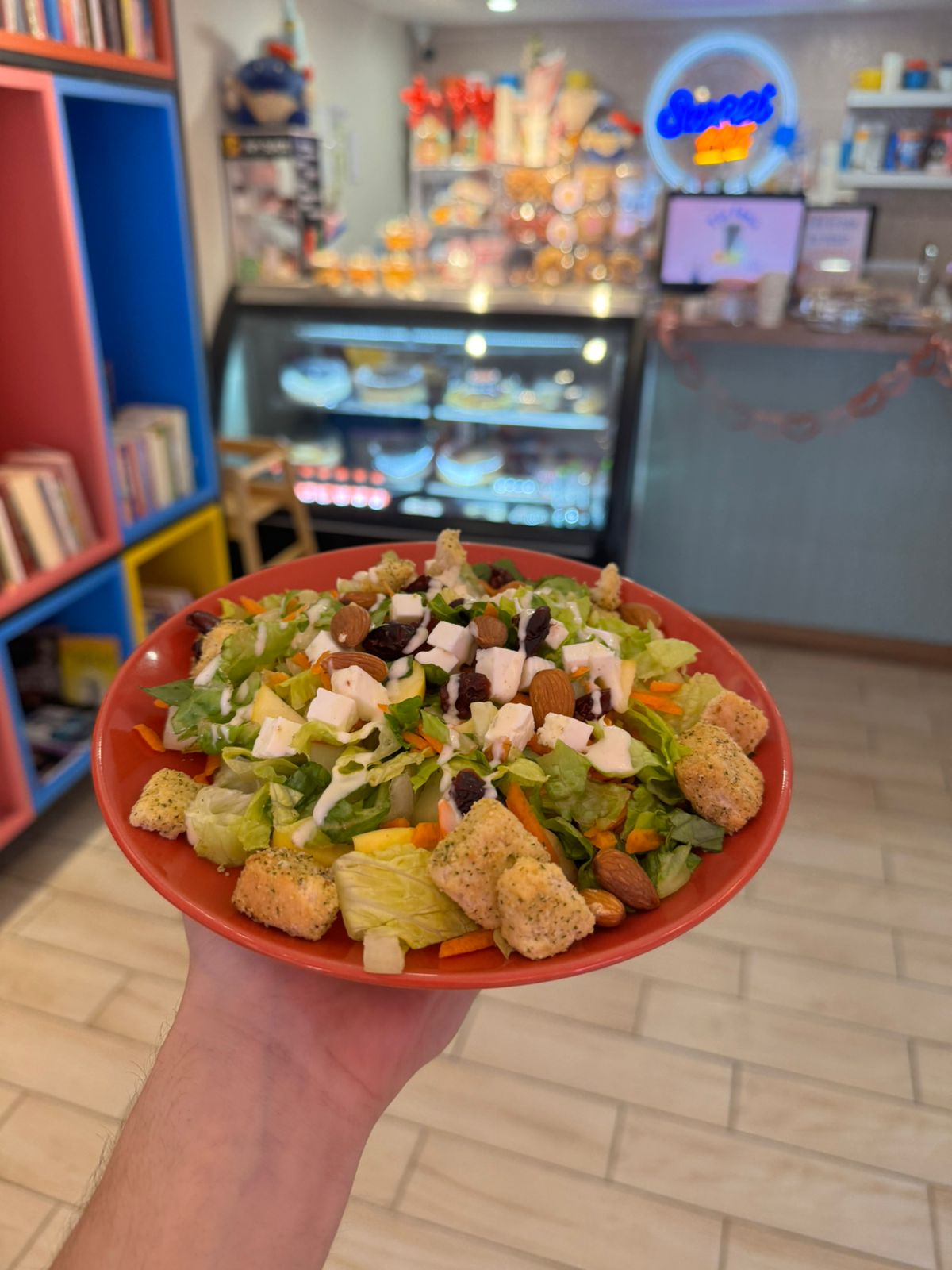 Colorida y deliciosa, con lechuga, zanahoria, manzana, arándanos y almendras.