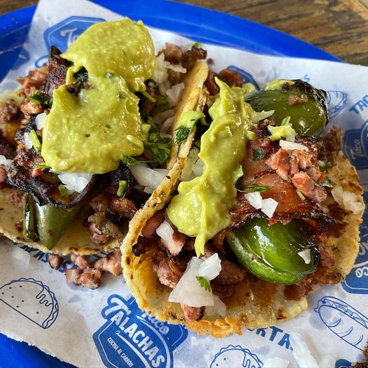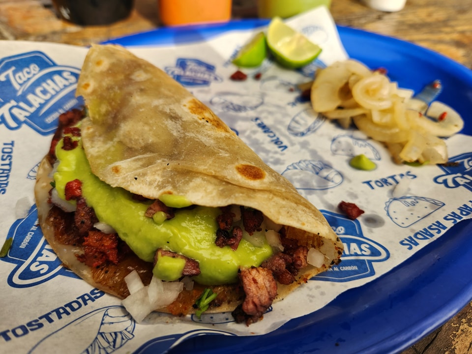 Deliciosa tortilla recién hecha dorada con una cama de queso con deliciosa carne de tu preferencia, guacamole, cebolla y cilantro