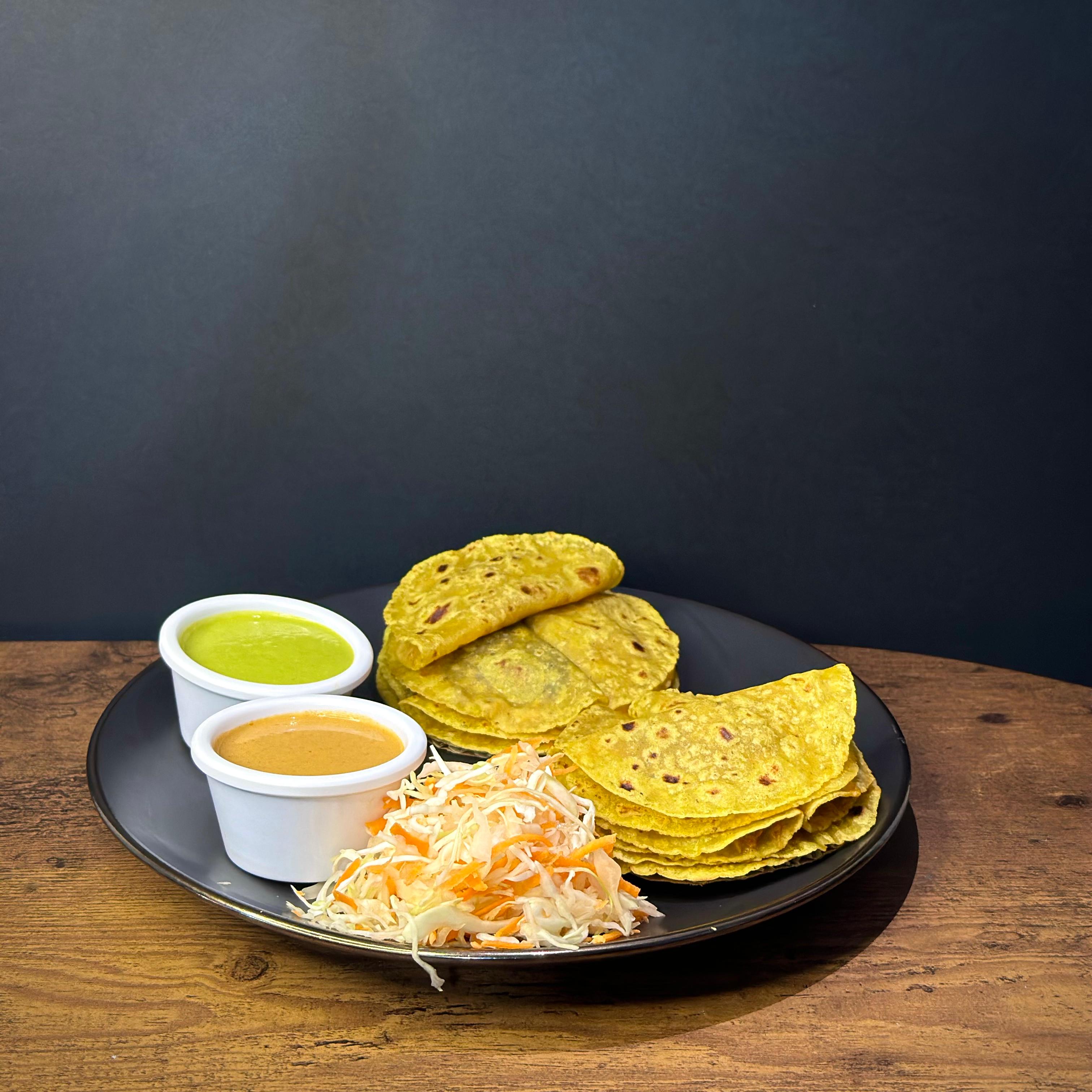 Paquete Especial, 5 tacos de carne y 5 surtidos acompañado de repollo y salsa