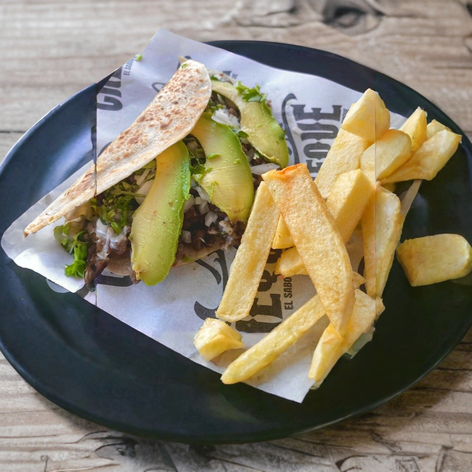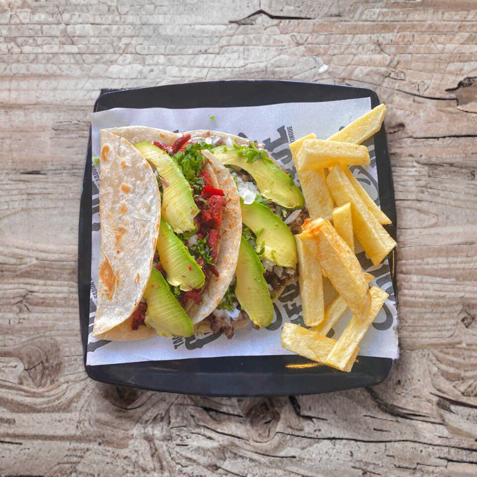 Taco en tortilla de harina con fajita, cilantro, cebolla, aguacate, con queso asadero.y papas