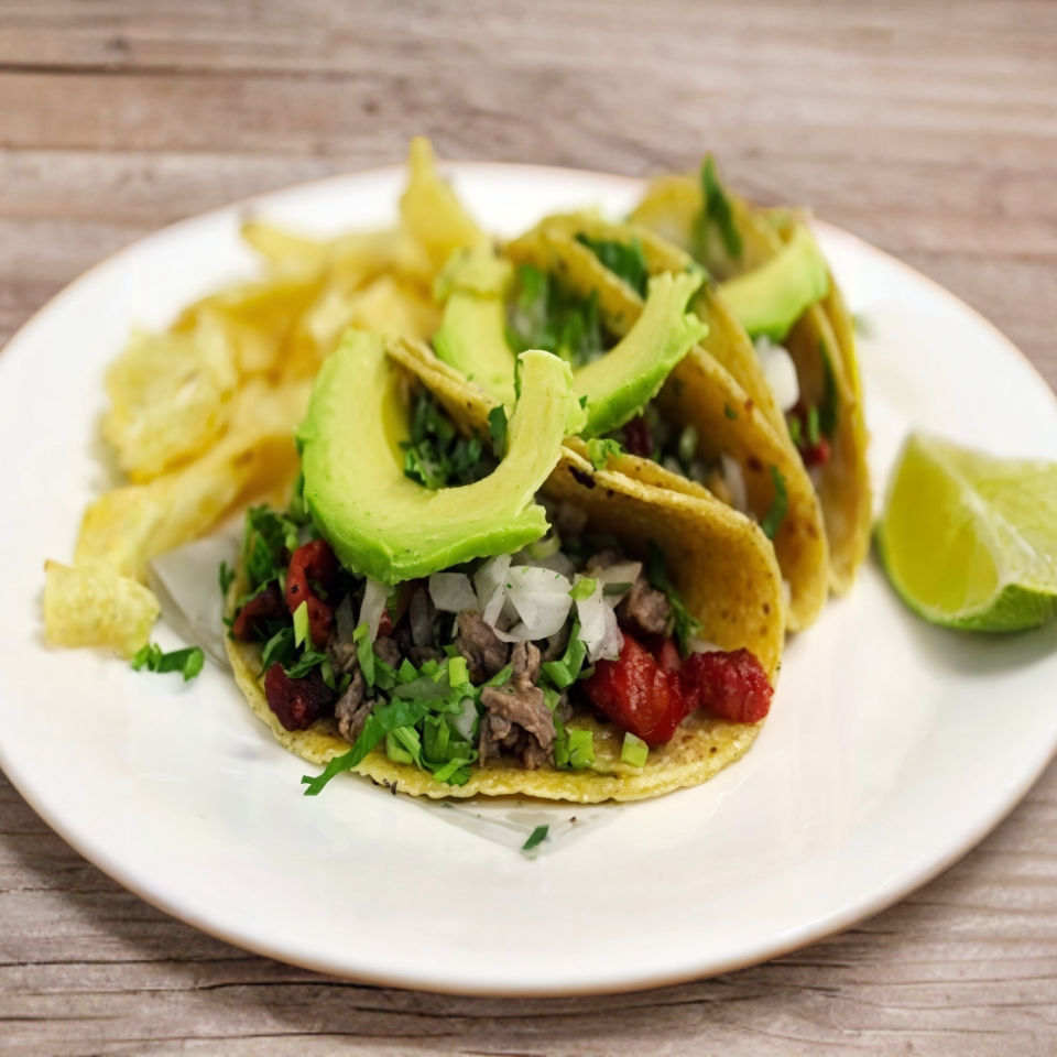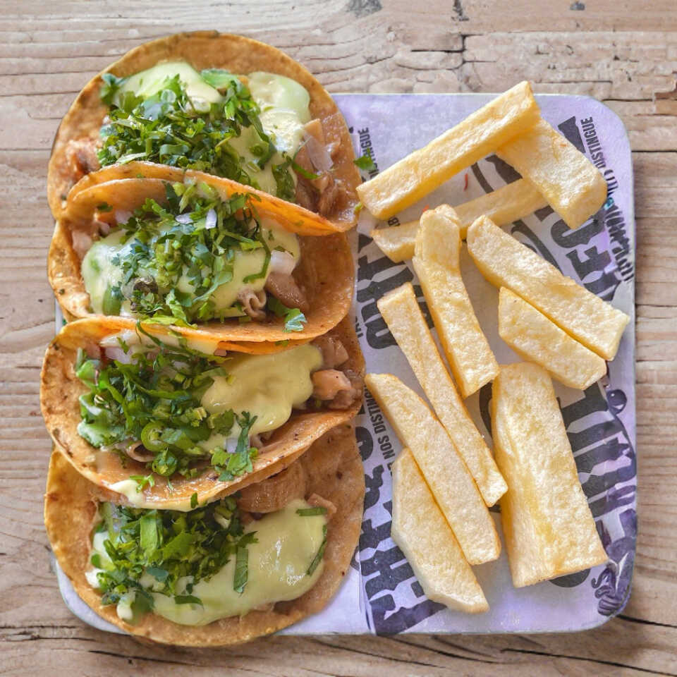Taco en tortilla de maiz, con cilantro, cebolla, aguacate, con queso asadero y papas