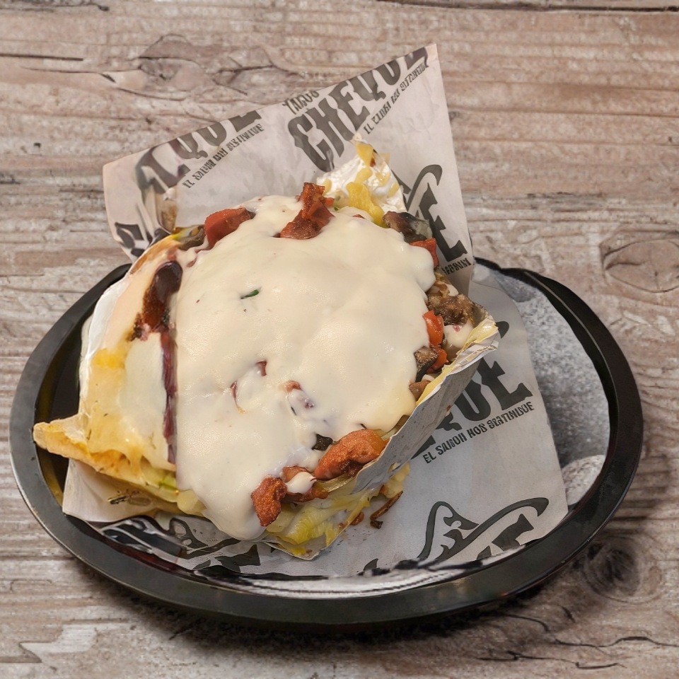 Papa con mantequilla, queso amarillo, queso asadero, crema y carne de tu elección