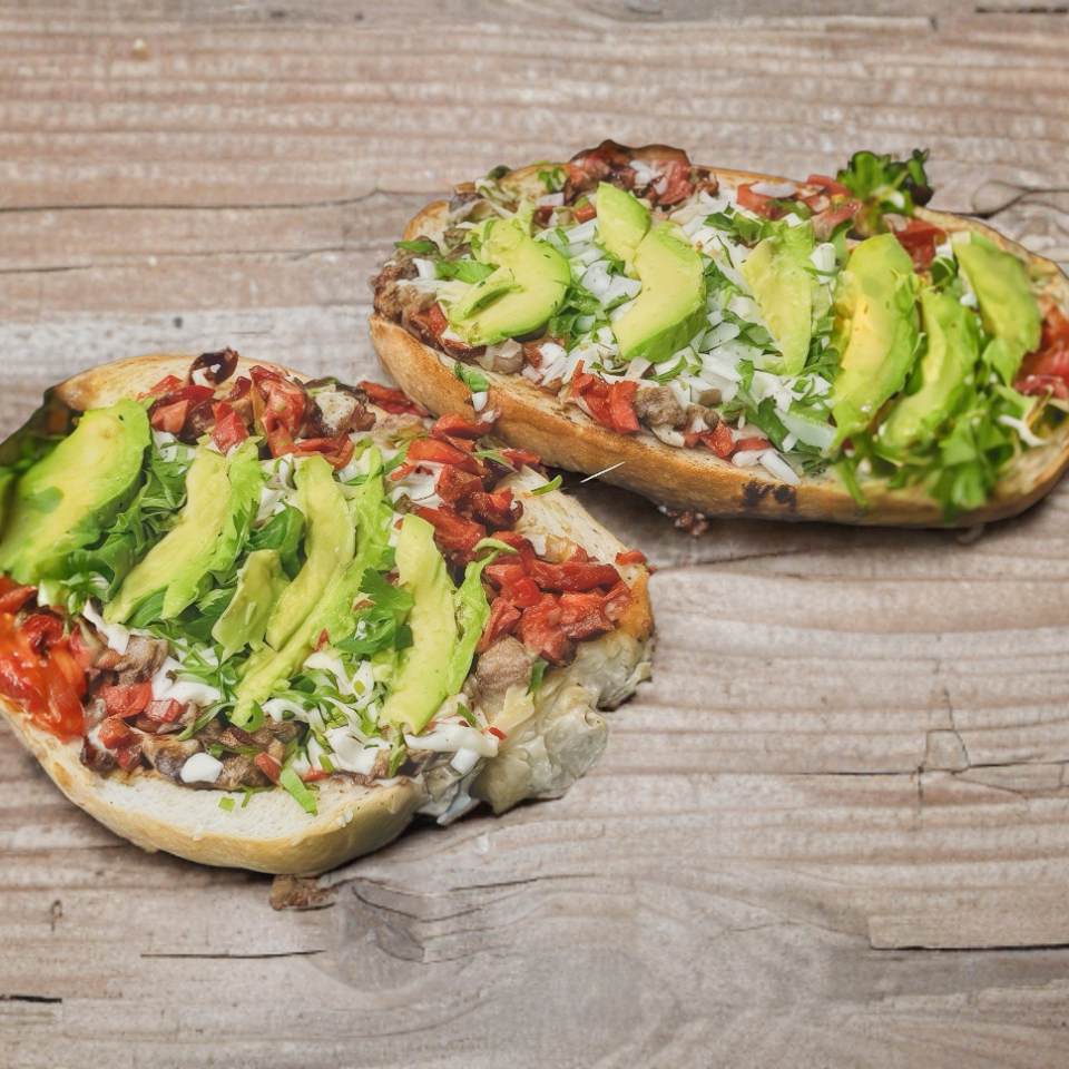 Torta con pan frances, cebolla, cilantro y aguacate, lleva queso asadero y más carne, incluye papas