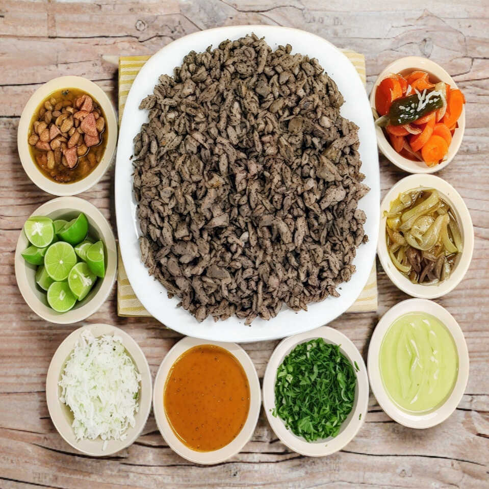 Kilo de cecina incluye 30 tortillas, verdura: cebolla cruda, cebolla cocida, cilantro, limones, salsas verde y roja, limones y medio litro de frijoles charros