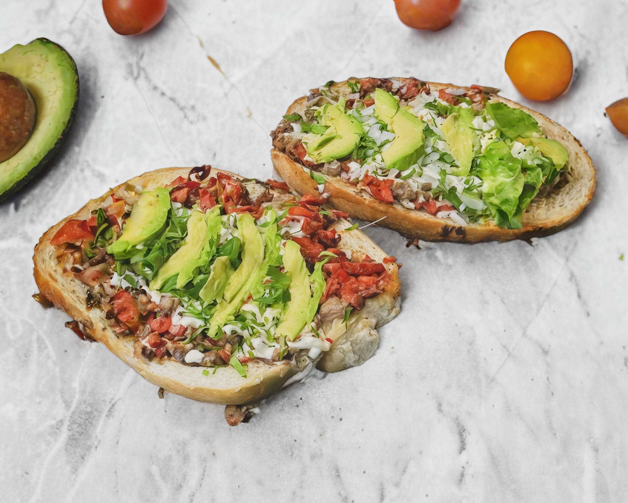Torta con pan frances, cebolla, cilantro, crema de aguacate y papas.