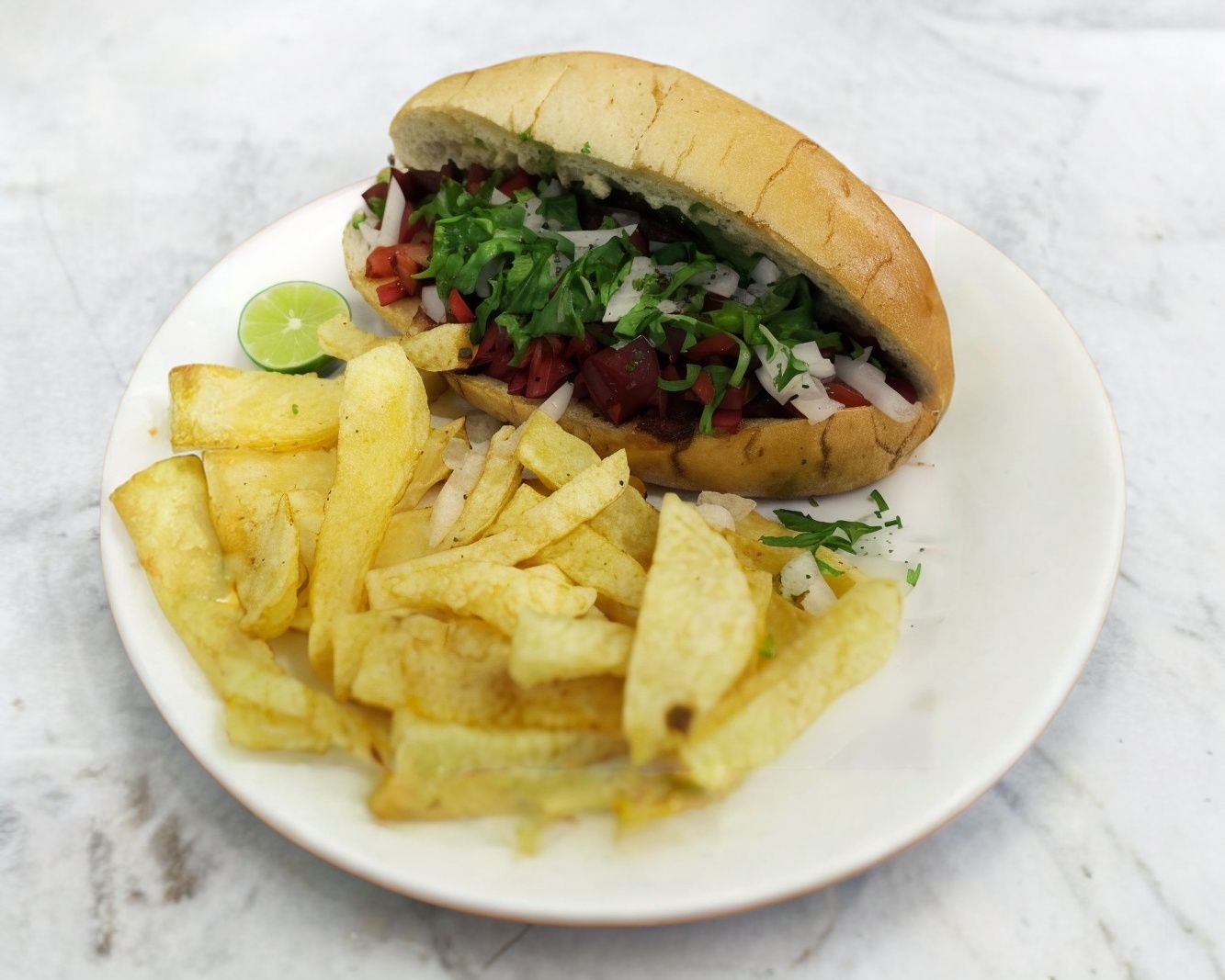 Torta con pan frances, cebolla, cilantro, aguacate y papas.