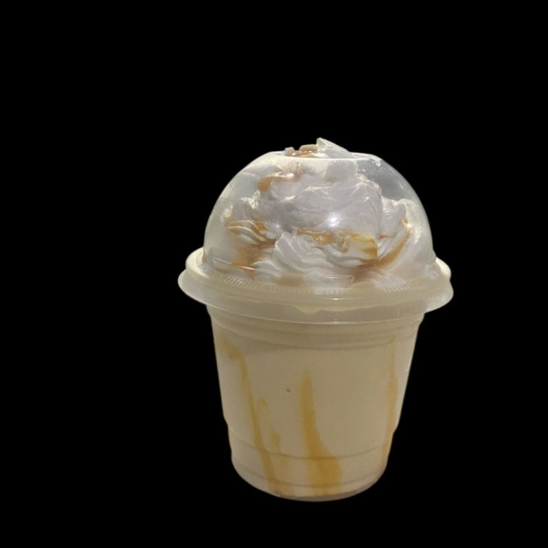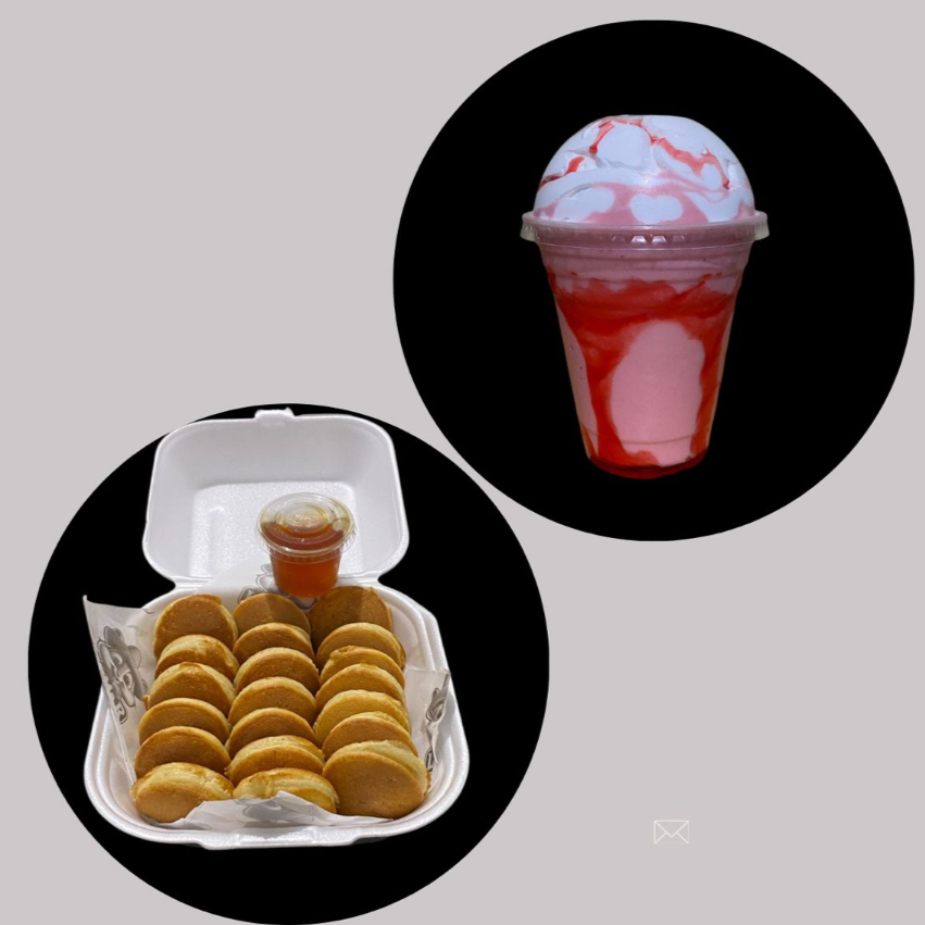 un mini frappe 10 onzas + 15mini hot cakes acompañado de miel de maple