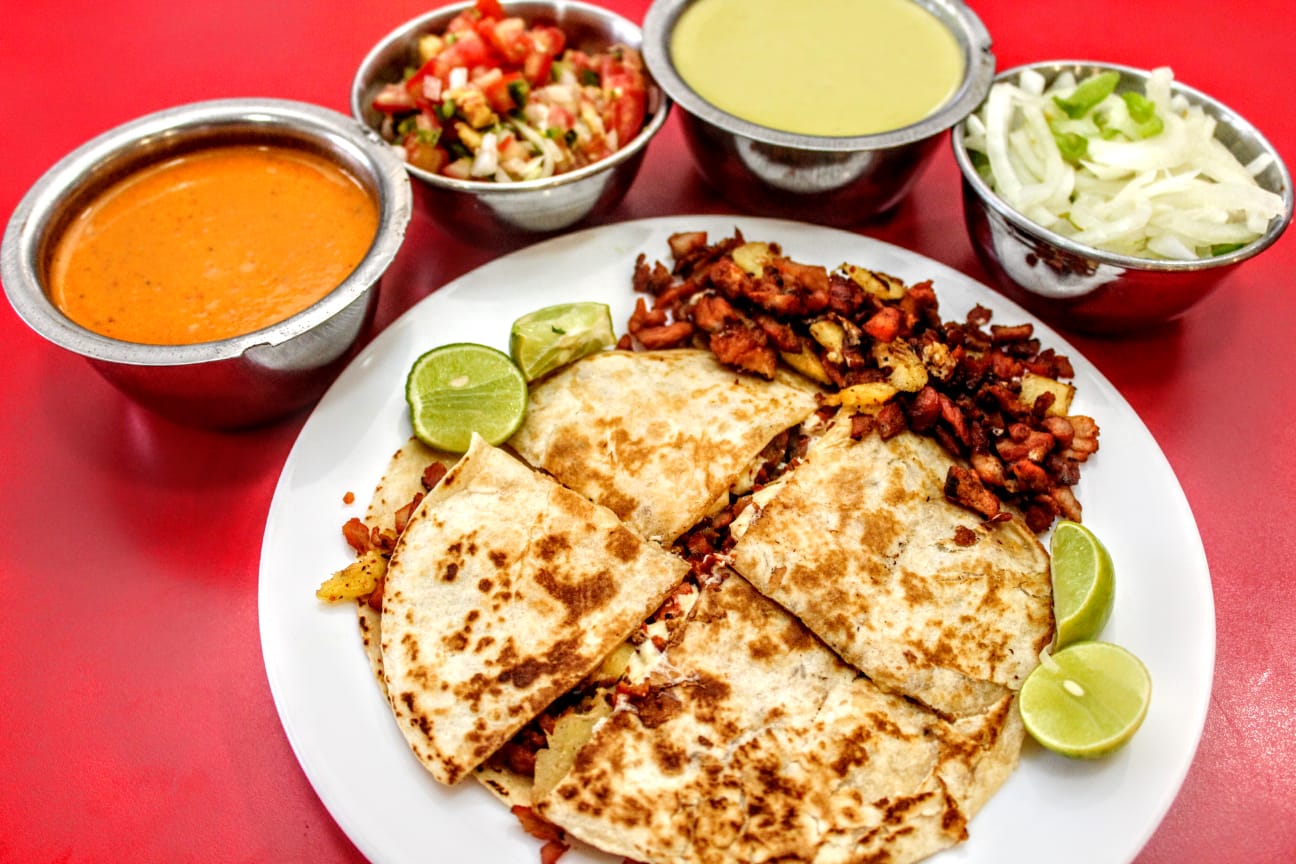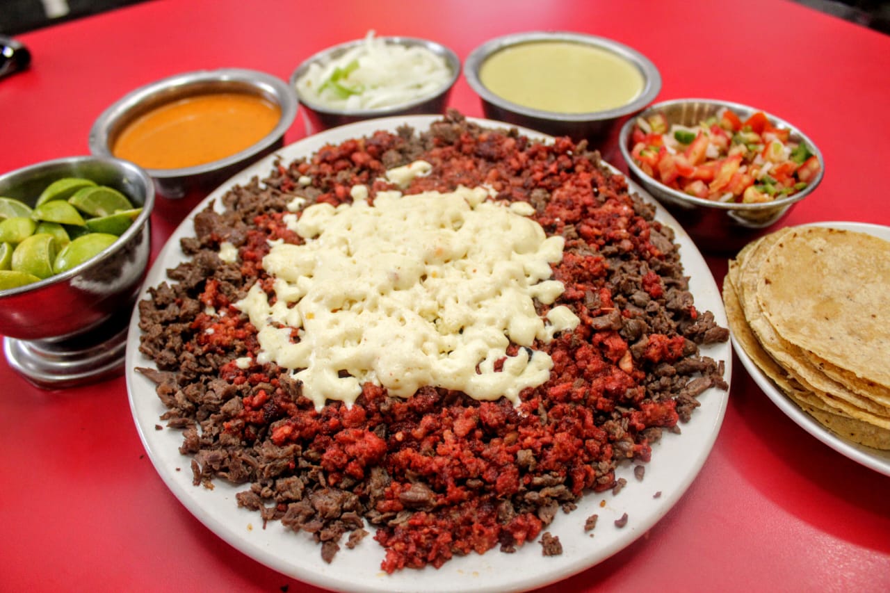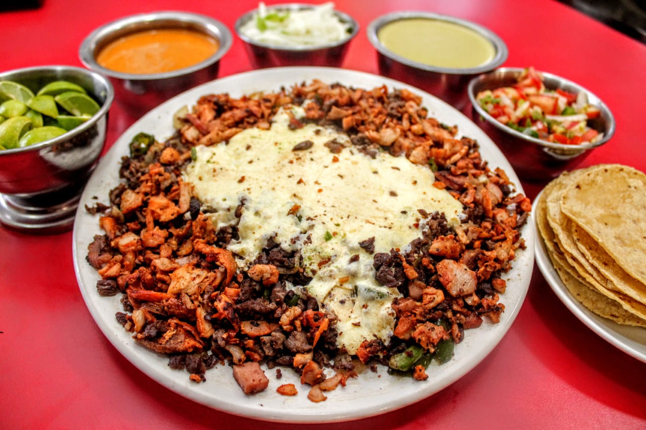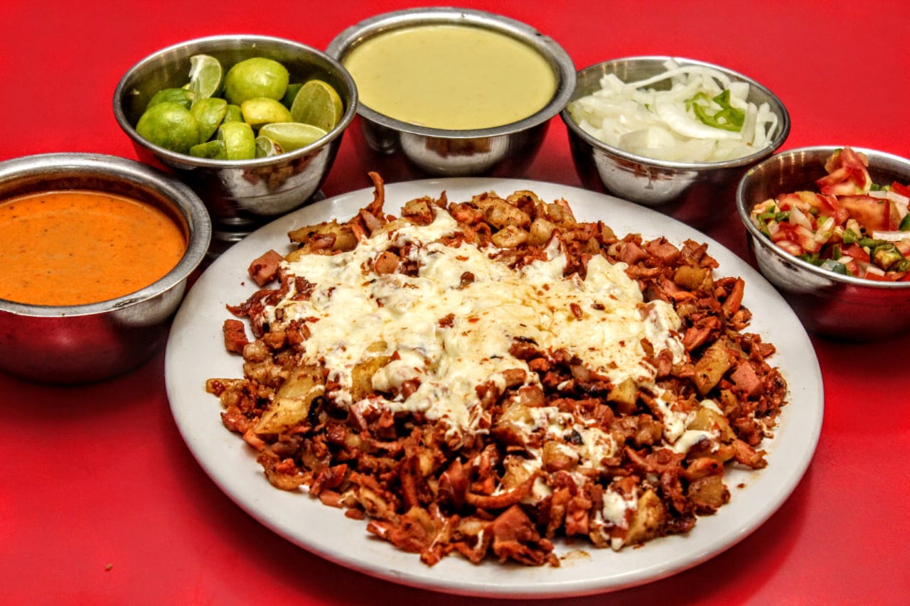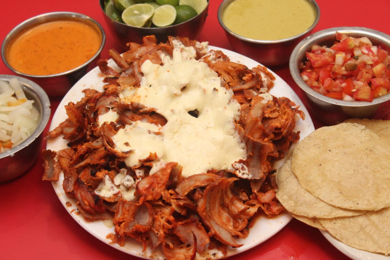 Con pastor, crema, mantequilla, queso amarillo y queso oaxaca, tortilla de maíz o totopos