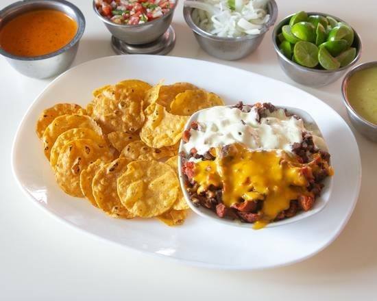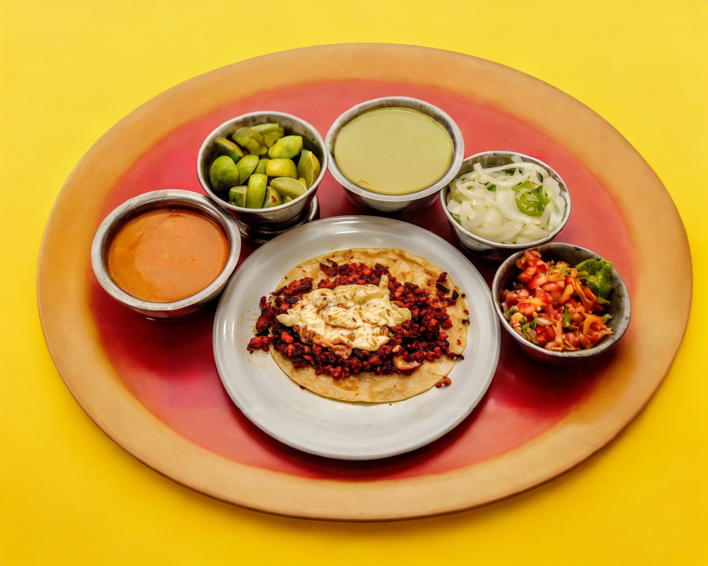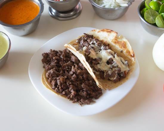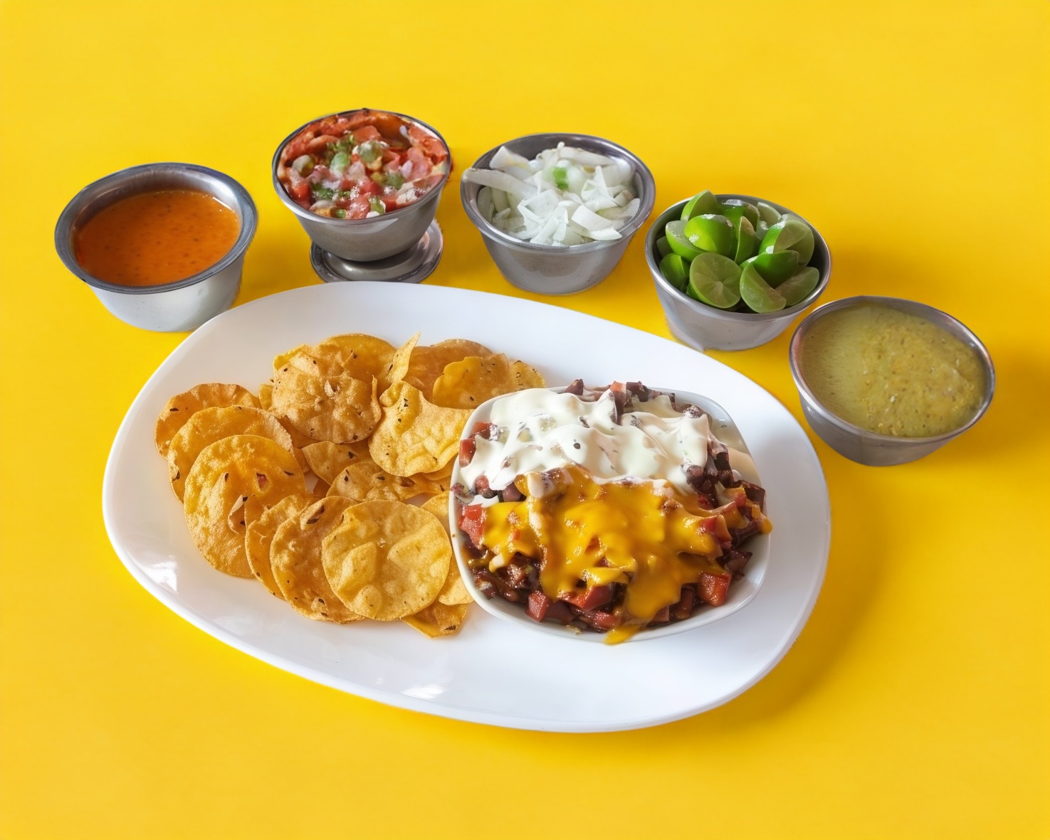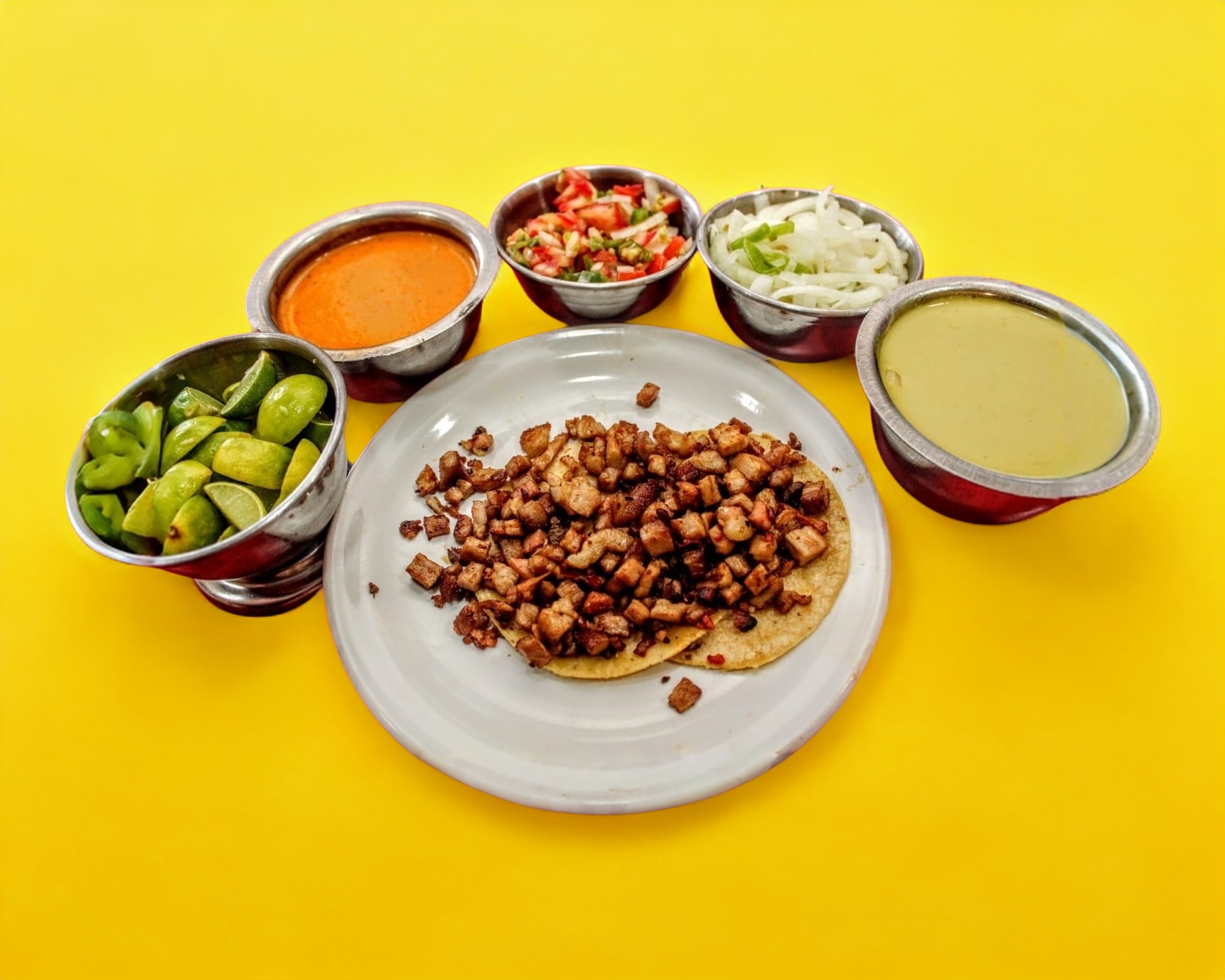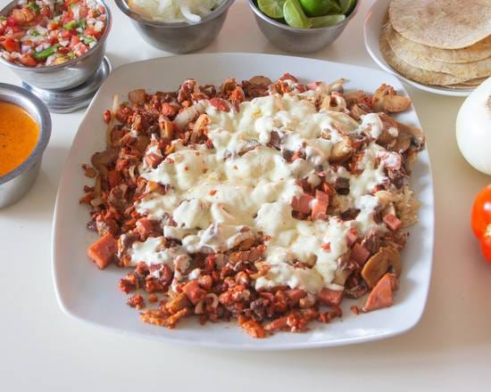 Pastor y fajita, crema, mantequilla, queso amarillo, queso oaxaca y 8 tortillas de maíz o totopos.