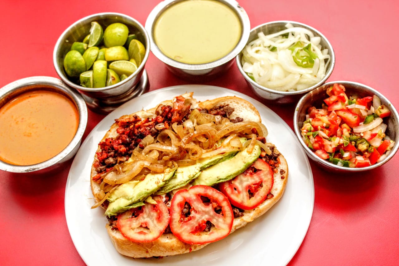 La torta mixta es carne de arrachera y pastor, incluye tomate, aguacate, cebolla asada y queso asadero.