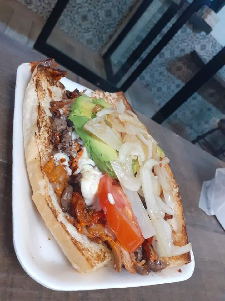 Fajita, jamón, pastor, morrón, cebolla y queso.