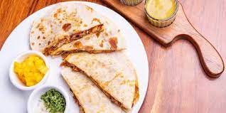 Fajita, pastor, piña y queso entre 2 tortillas de harina.