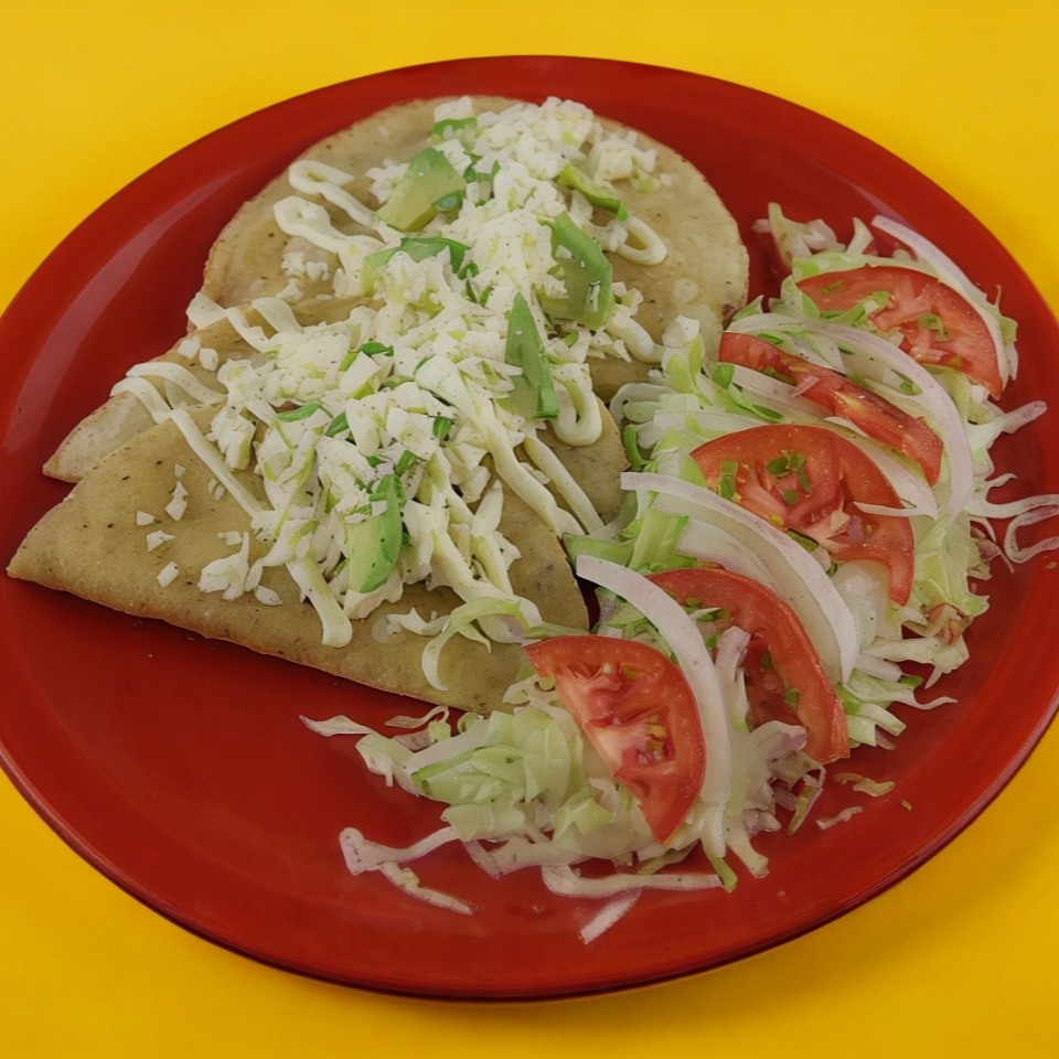 Relleno a elegir, acompañadas de: Lechuga, tomate, cebolla, aguacate, queso, crema y salsa roja