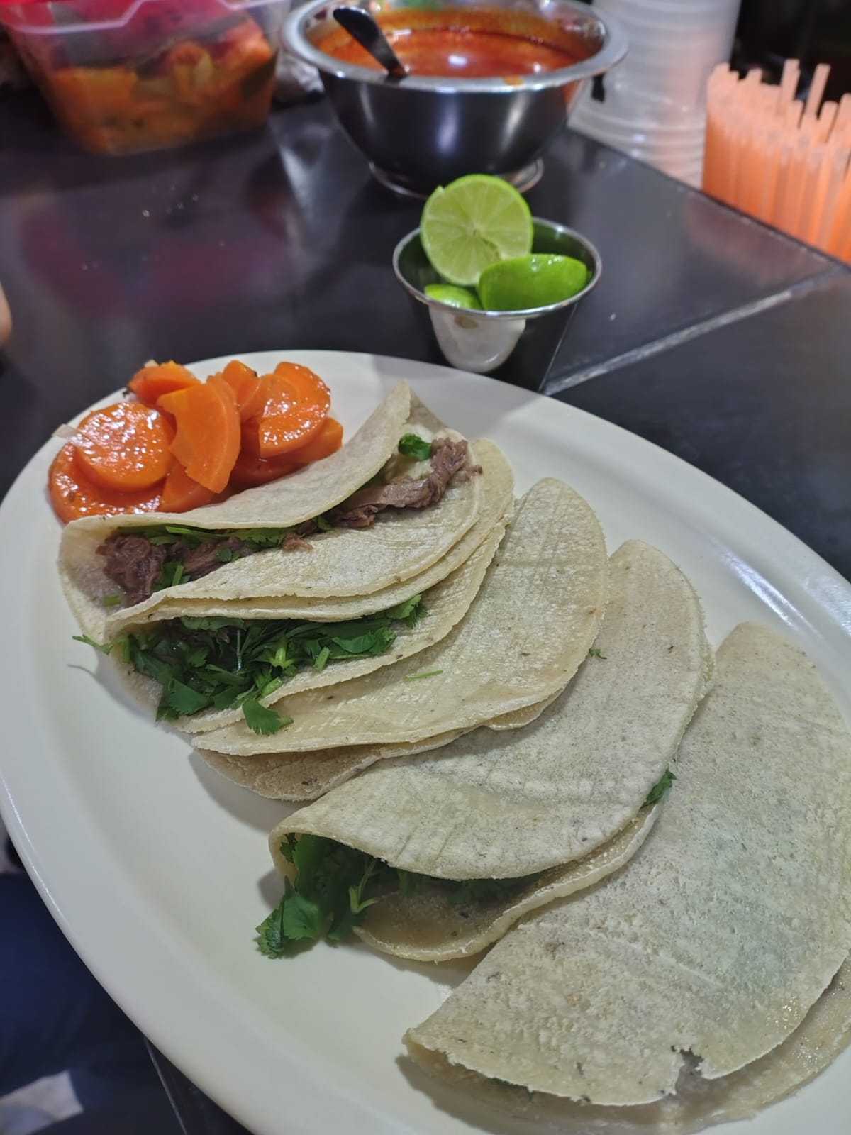 1 kilo de barbacoa de res, cebolla, cilantro, salsas y zanahoria.