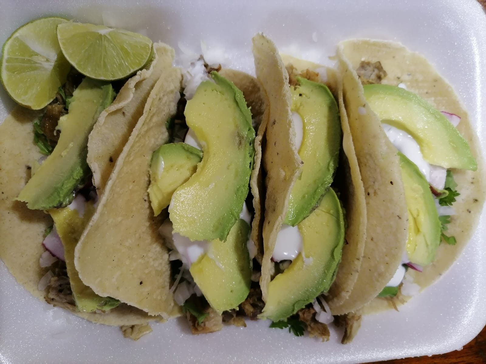 Carne de cerdo, cebolla, cilantro, rábano, crema y aguacate.