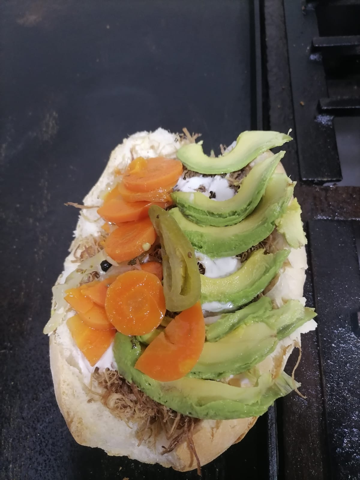 Mayonesa, lechuga, cebolla, tomate, carne deshebrada, crema, aguacate y zanahorias.