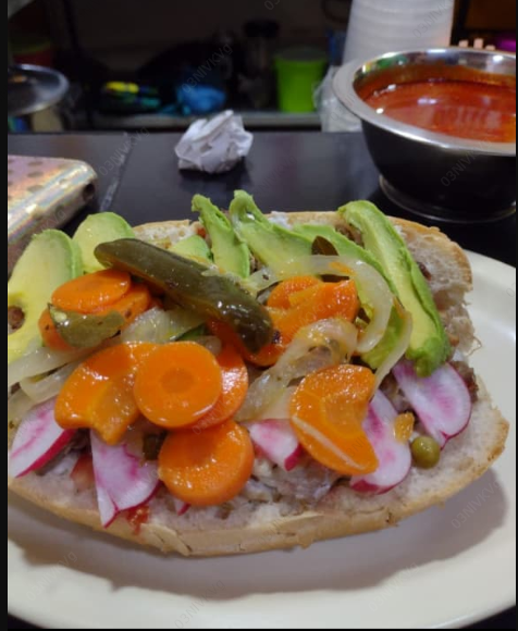 Frijol, chorizo, jamón, lechuga, cebolla, tomate, queso de puerco, aguacate, queso amarillo, carne y queso blanco.